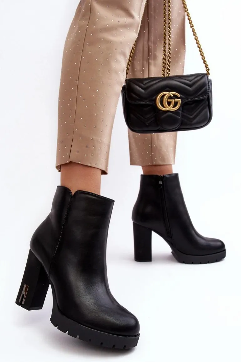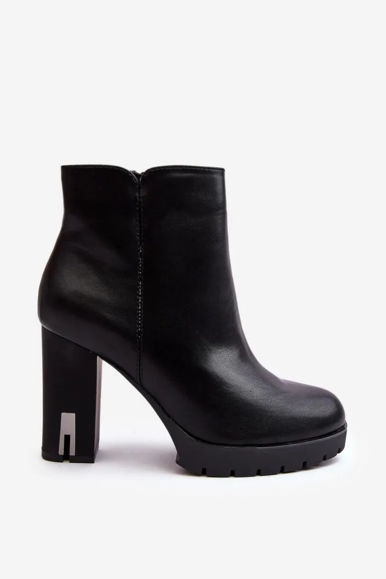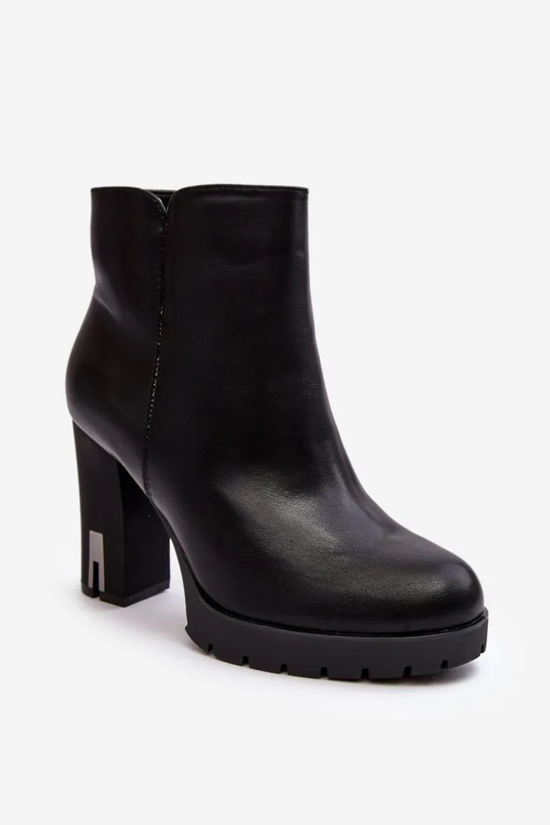 Damskie botki wykonane z eko skóry. Osadzone na platformie i obcasie w postaci słupka. Model ten zapinany jest na suwak z boku cholewki. Noski zaokrąglone. Usztywniony zapiętek. Miękka wkładka zapewni komfortowe użytkowanie obuwia. Idealne do jesiennych stylizacji! Przy wyborze rozmiaru prosimy sugerować się tabelą rozmiarów.