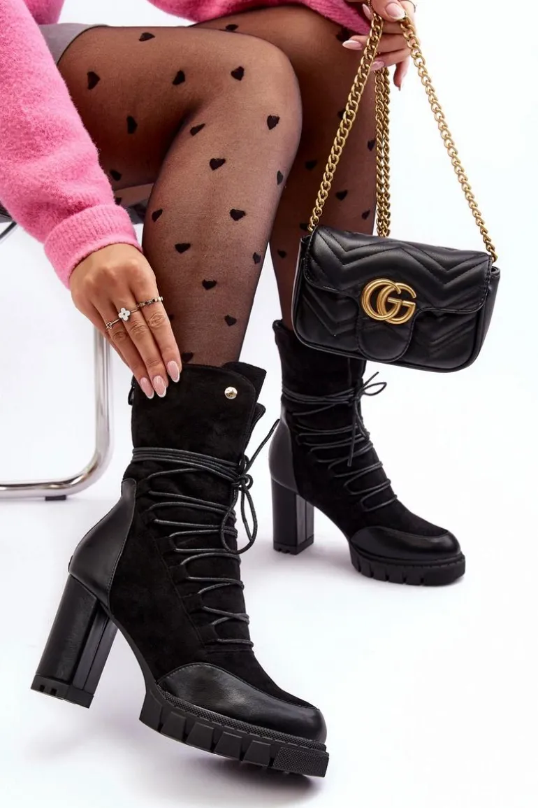 Damskie botki osadzone na platformie i masywnym obcasie w postaci słupka. Wykonane z połączenia eko skóry i eko zamszu. Z tyłu cholewki suwak. Ocieplone kocem obuwniczym w środku. Noski zaokrąglone. Zapiętek usztywniony. Koniecznie musisz je mieć! Przy wyborze rozmiaru prosimy sugerować się tabelą rozmiarów.