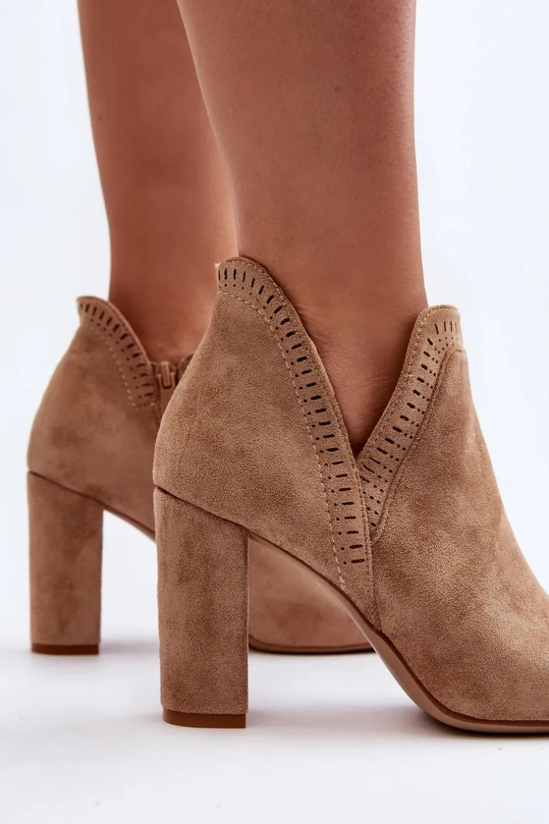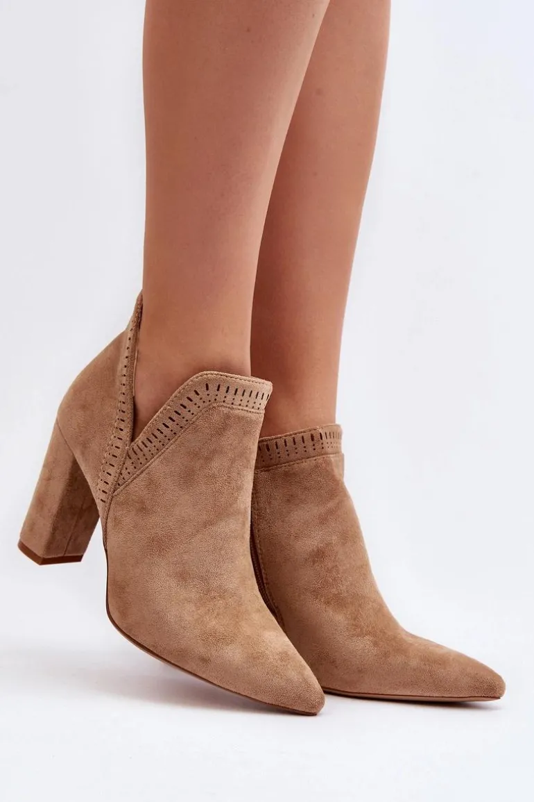 Botki damskie wykonane z miłego w dotyku eko zamszu. Osadzone na obcasie w postaci słupka. Noski w szpic optycznie wysmuklą nogi. Cholewka za kostkę z wycięciem oraz ażurowym wzorkiem. Zapinane na suwak z boku. Dodatkowo model ten posiada usztywniony zapiętek. Miękka wkładka zapewni wygodę podczas noszenia. Idealne do wiosennych stylizacji. Koniecznie musisz je mieć! Przy wyborze rozmiaru prosimy sugerować się tabelą rozmiarów.