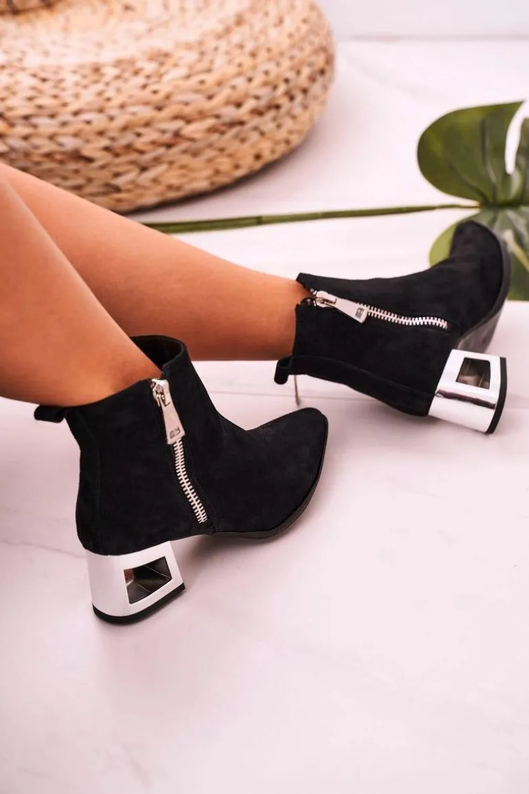 Damskie Botki Na Srebrnym Obcasie Zamszowe Czarne Norah