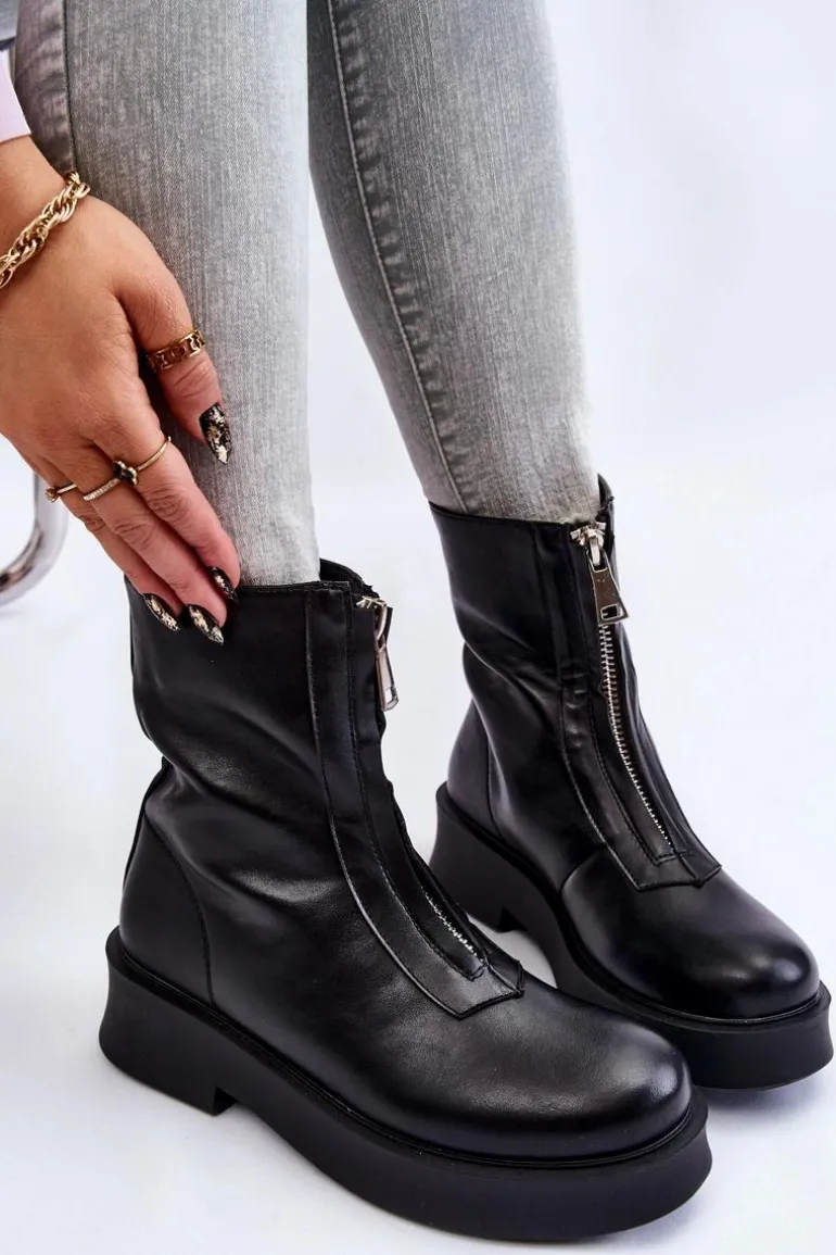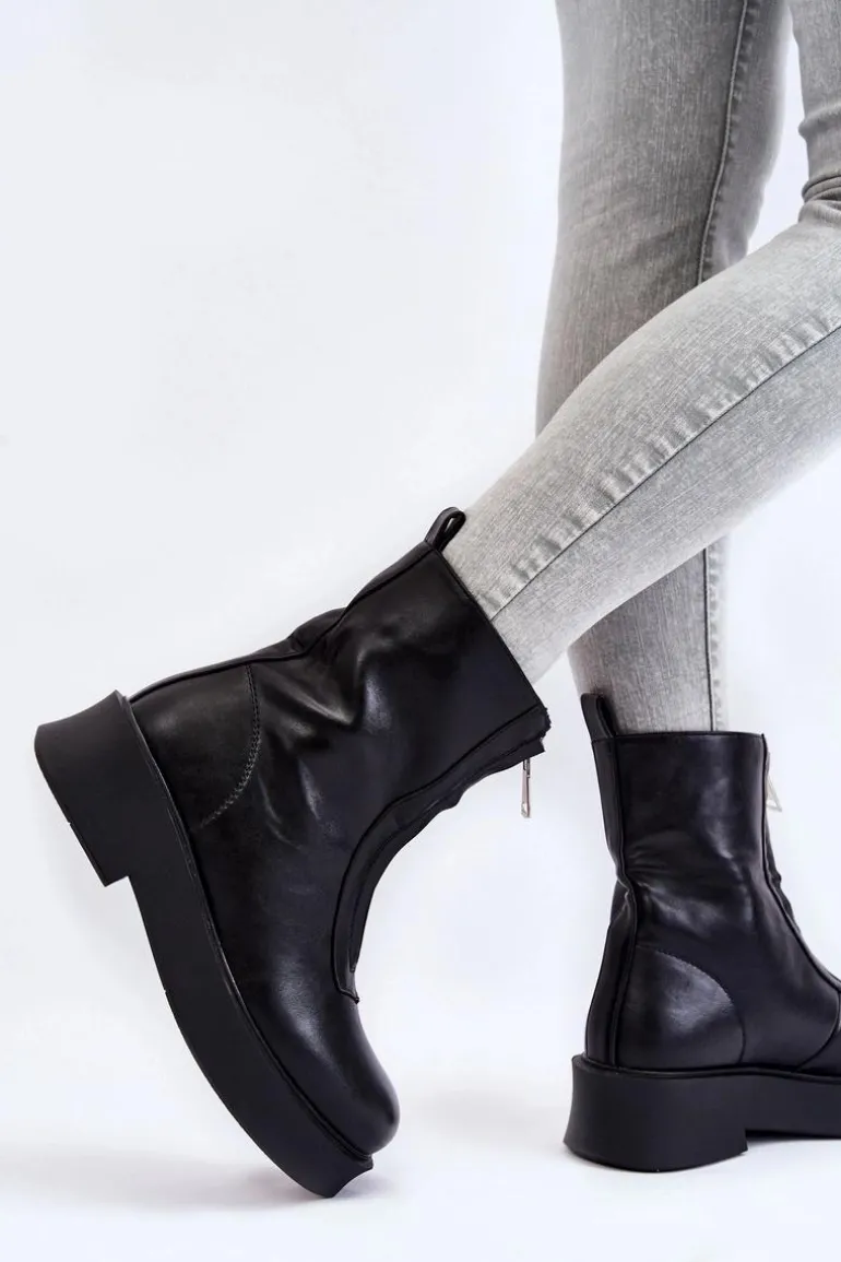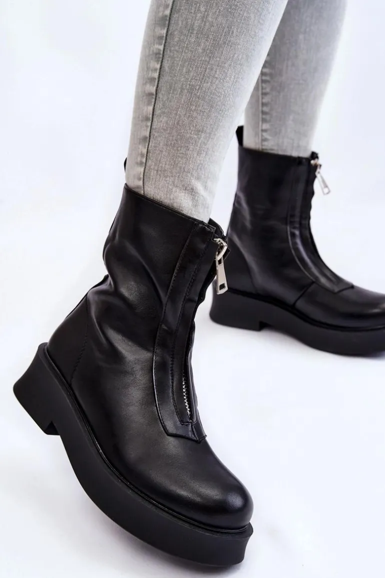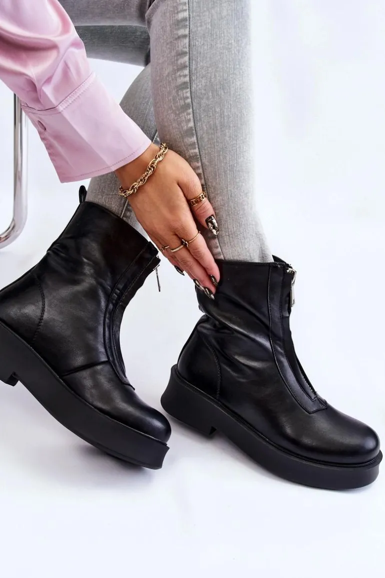 Klasyczne, damskie botki zostały wykonane z eko skóry. Posiadają usztywniany zapiętek. Osadzone na płaskim obcasie i masywnej platformie. Zapinane z przodu na suwak. Model za kostkę świetnie sprawdzi się w wielu stylizacjach. Wyściółka materiałowa. Koniecznie powinnaś mieć ten model w swojej szafie! Przy wyborze rozmiaru prosimy sugerować się tabelą rozmiarów.