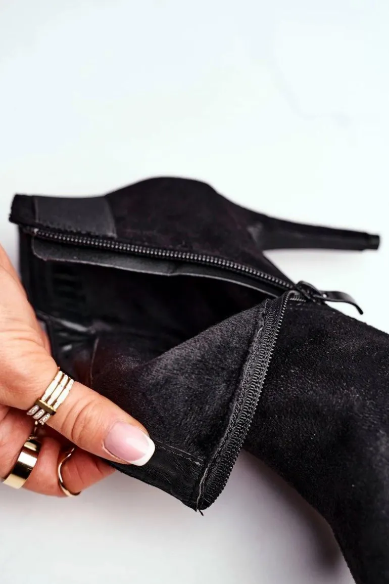 Eleganckie botki na szpilce z delikatnym ociepleniem w postaci koca obuwniczego. Botki wykonane są z eko zamszu. Koniecznie sprawdź całą naszą kolekcję damskich botków! Przy wyborze rozmiaru prosimy sugerować się tabelą rozmiarów.