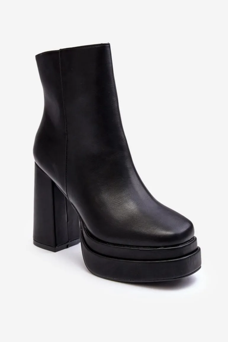 Masywne botki damskie wykonane z eko skóry. Osadzone na wysokim obcasie w postaci słupka i platformie. Noski w kwadrat. Zapiętek jest usztywniony. Model ten zapinany jest na suwak z boku. Botki te doskonale sprawdzą się w jesiennych stylizacjach. Przy wyborze rozmiaru prosimy kierować się tabelą rozmiarów