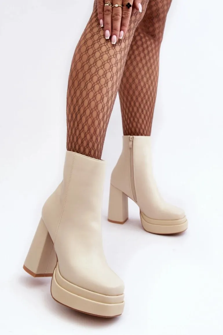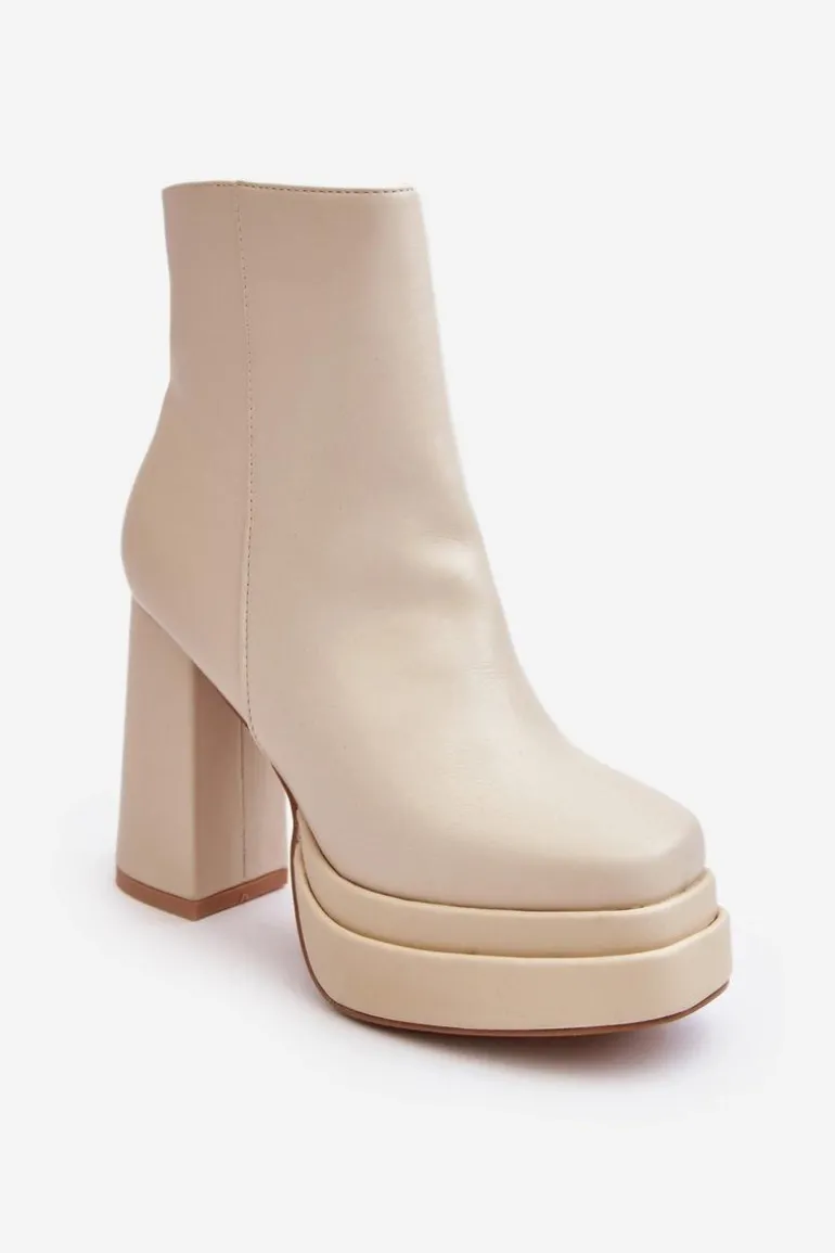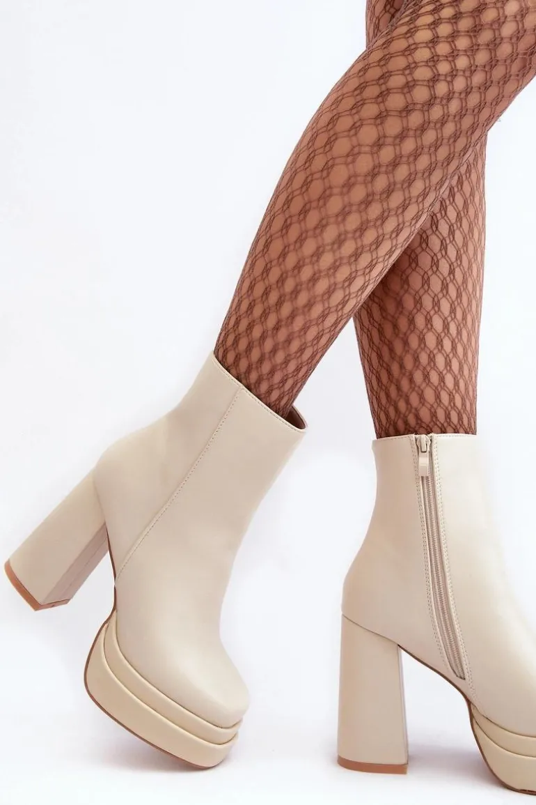 Masywne botki damskie wykonane z eko skóry. Osadzone na wysokim obcasie w postaci słupka i platformie. Noski w kwadrat. Zapiętek jest usztywniony. Model ten zapinany jest na suwak z boku. Botki te doskonale sprawdzą się w jesiennych stylizacjach. Przy wyborze rozmiaru prosimy kierować się tabelą rozmiarów