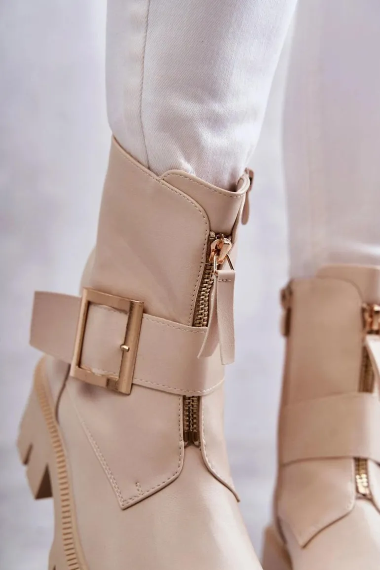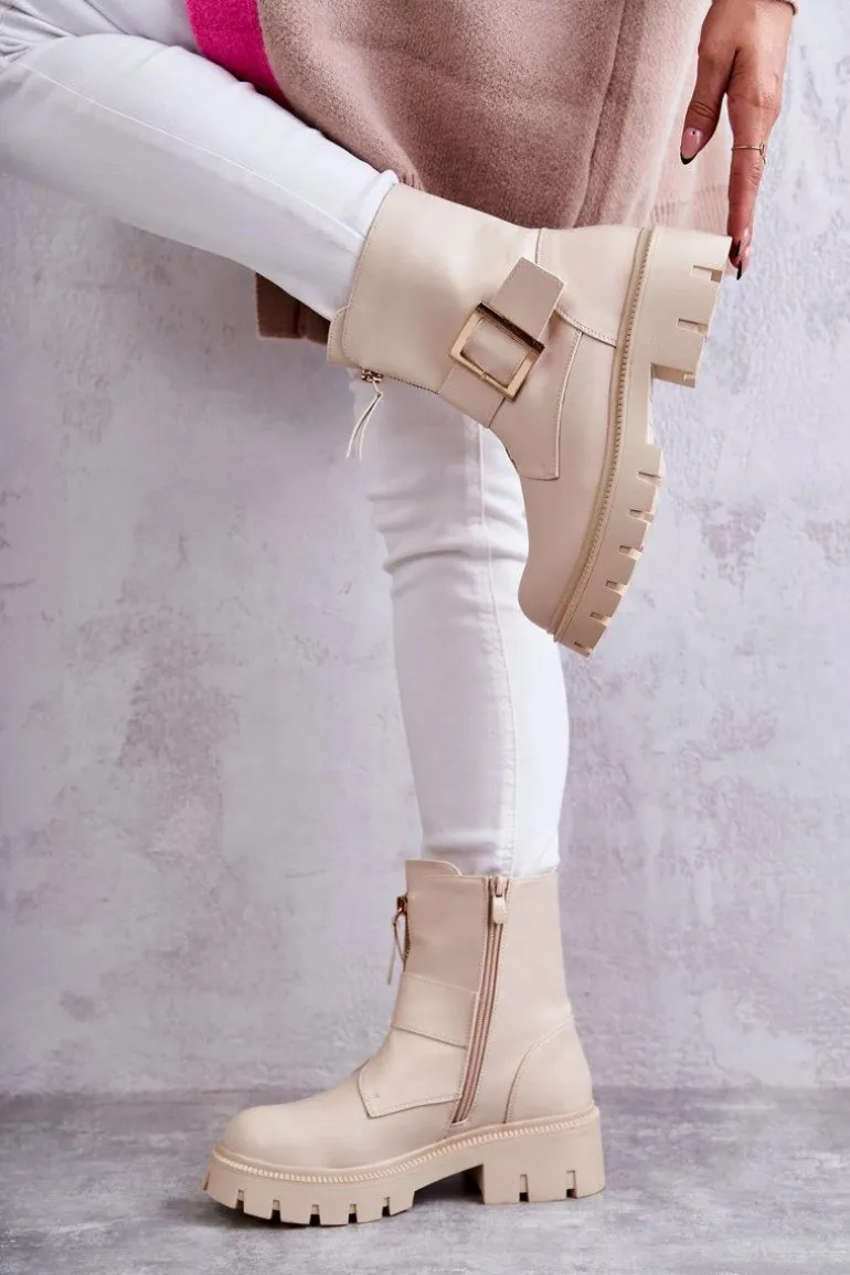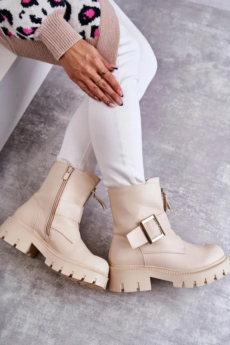 Modne botki damskie zostały wykonane z eko skóry. Model ten posiada usztywniany zapiętek. Zamykane na suwak. Dodatkowo botki posiadają ozdobną klamrę z boku cholewki oraz ozdobny suwak na przodzie. Osadzone na płaskim obcasie oraz platformie. Nosek zaokrąglony. Koniecznie sprawdź pozostałe modele płaskich botków! Przy wyborze rozmiaru prosimy sugerować się tabelą rozmiarów.