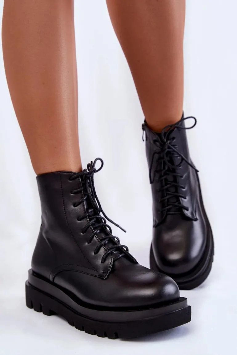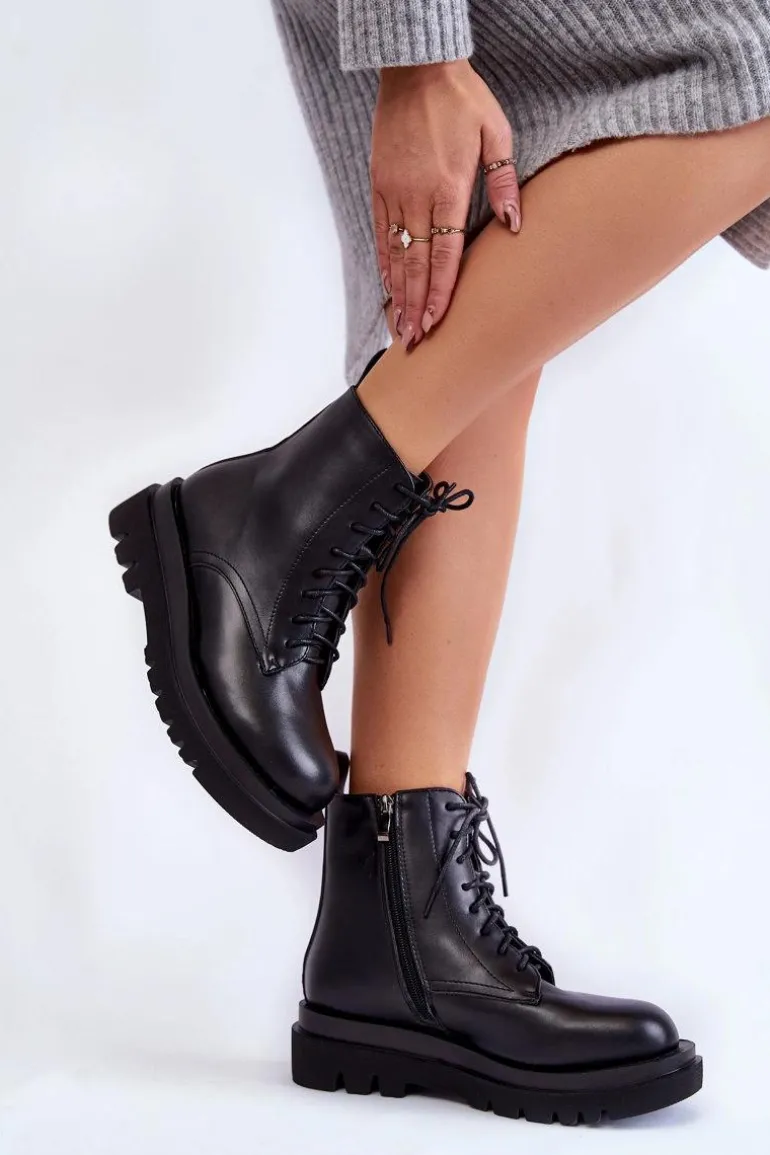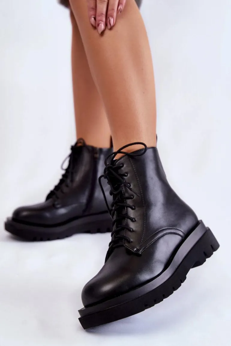 Damskie botki zostały wykonane z eko skóry. Posiadają solidne sznurowanie oraz suwak z boku cholewki. Model osadzony na płaskim obcasie i platformie ze żłobieniami. Wewnątrz botki ocieplono miłym w dotyku, krótkim futerkiem. Usztywniany zapiętek zapewni odpowiednią stabilność. Model ten wykorzystasz do wielu stylizacji. Przy wyborze rozmiaru prosimy sugerować się tabelą rozmiarów.