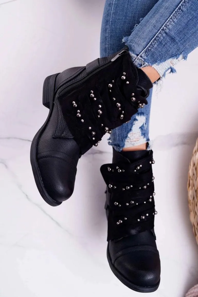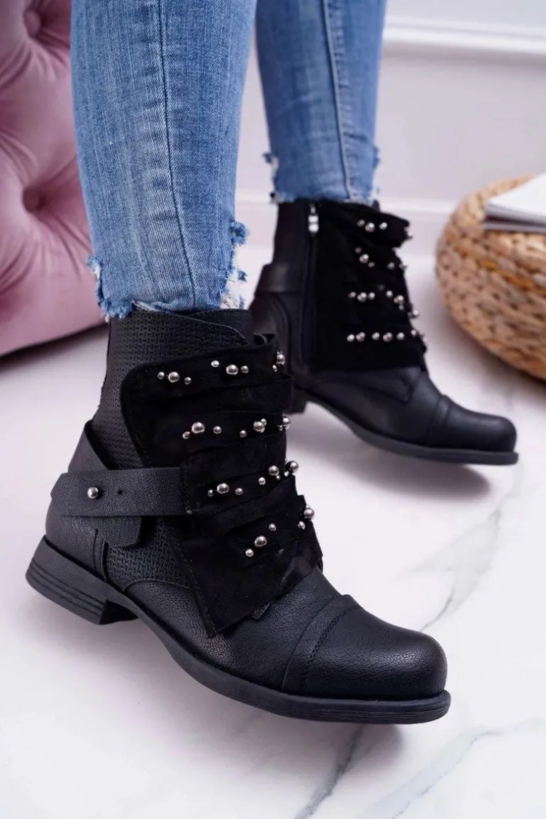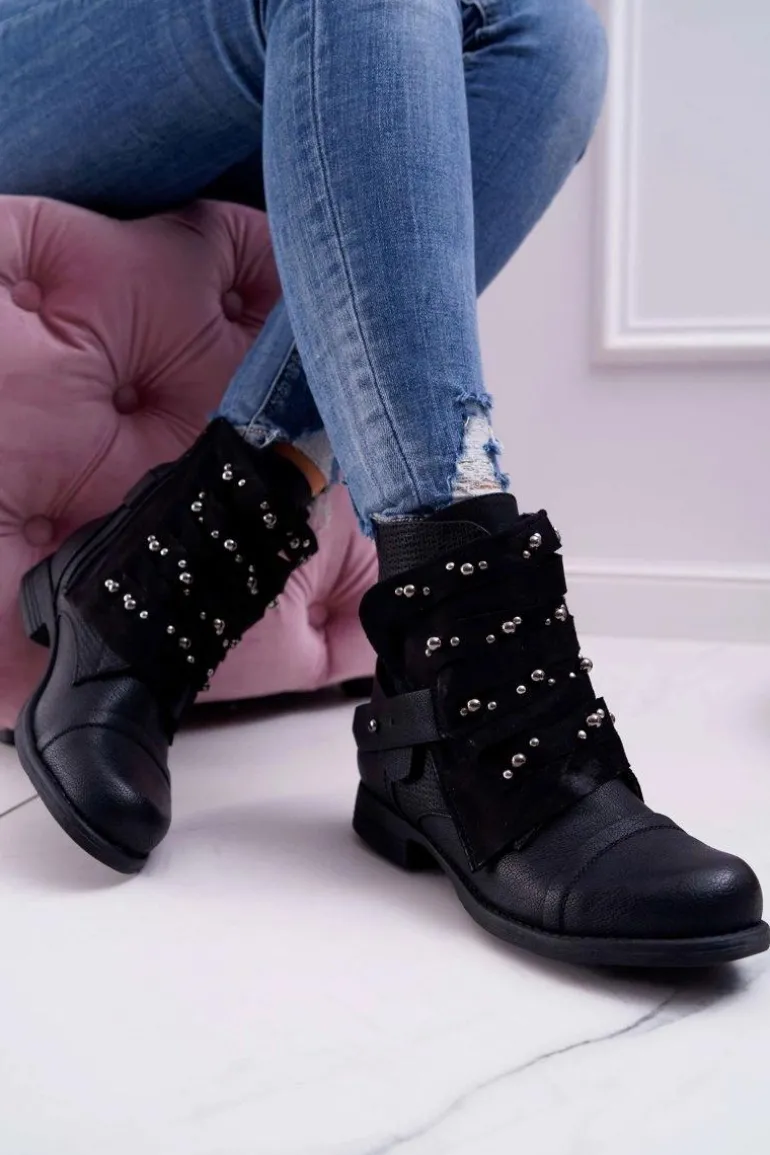 Damskie Botki Płaski Obcas Z Dżetami Czarne Valko