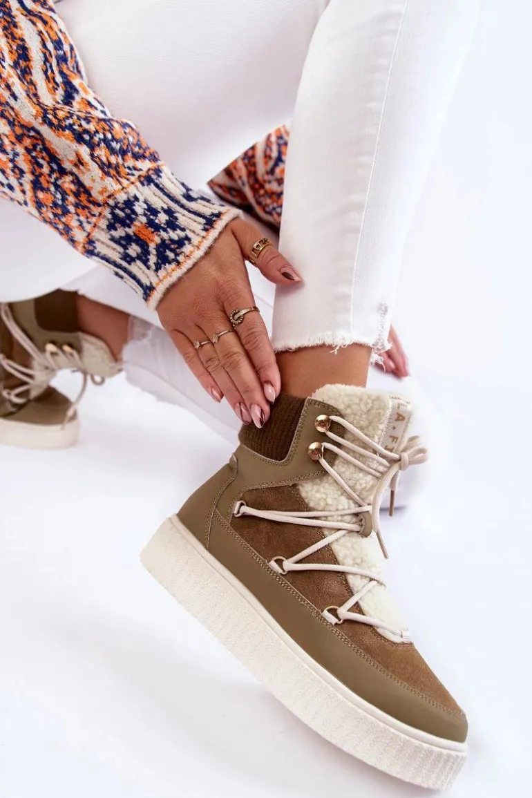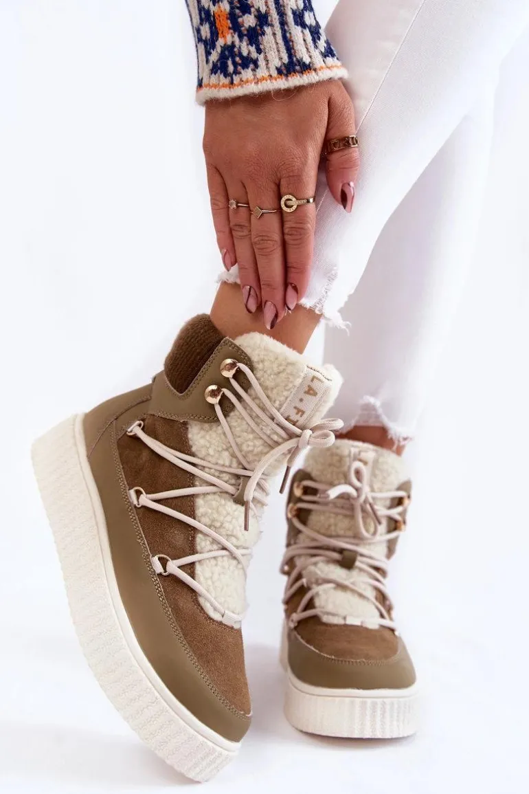 Damskie botki — śniegowce świetnie sprawdzą się w chłodniejsze dni! Wykonane z połączenia naturalnego zamszu oraz eko skóry. Osadzone na masywnej platformie. Posiadają klasyczne sznurowanie. Cholewka zakończona ściągaczem, co pozwoli na odpowiednie dopasowanie do tęgości nogi. Dodatkowo botki posiadają usztywniany zapiętek. Ocieplone wewnątrz miłym w dotyku, delikatnym futerkiem. Przy wyborze rozmiaru prosimy sugerować się tabelą rozmiarów.