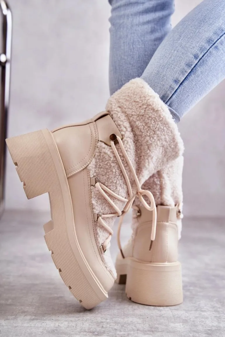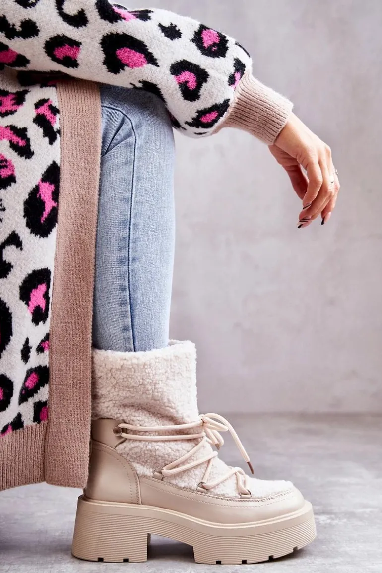 Cudowne botki w formie śniegowców zostały wykonane z materiału przypominającego kożuszek oraz eko skóry. Model klasycznie sznurowany. Botki zostały osadzone na płaskim obcasie i masywnej platformie. Posiadają w środku ocieplenie w postaci koca obuwniczego. Antypoślizgowa podeszwa zapewni stabilność na każdym kroku! Przy wyborze rozmiaru prosimy sugerować się tabelą rozmiarów.