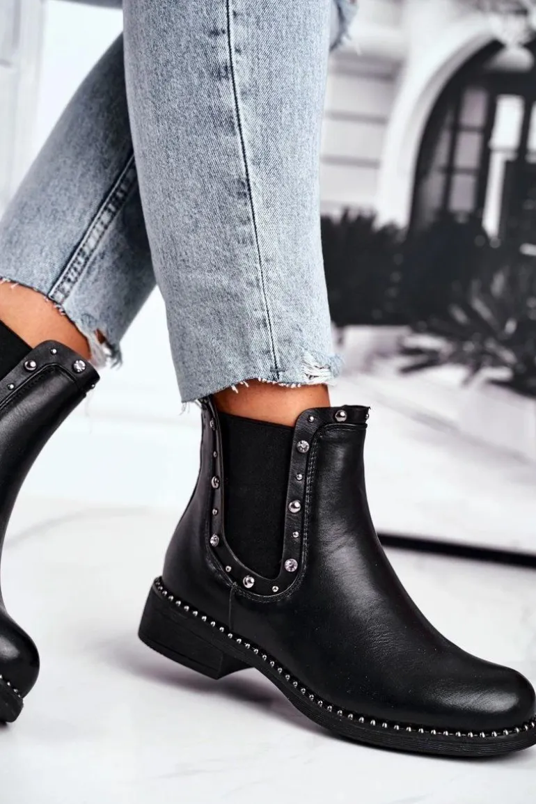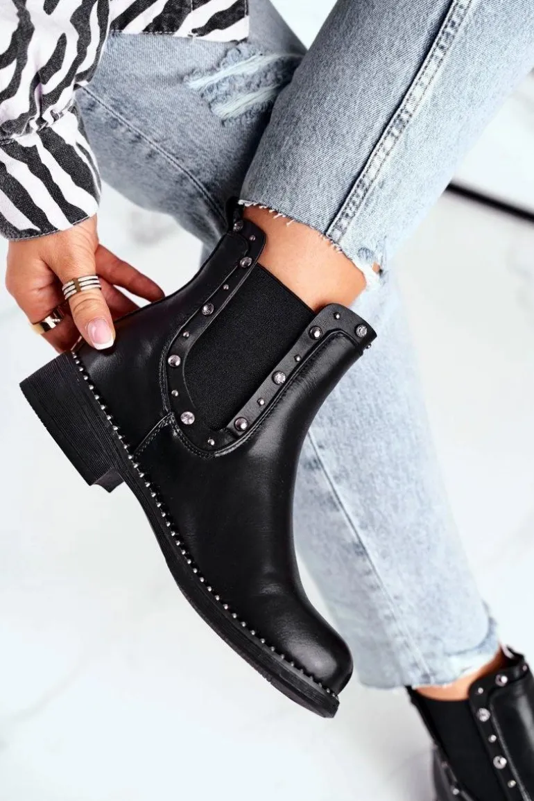 Świat mody nieustannie staje na głowie, by nas zaskoczyć. Spójrz zatem na te przepiękne sztyblety! W całości wykonane ze skóry ekologicznej, wewnątrz ocieplone kocem obuwniczym, więc o ciepło w chłodnie dni nie musisz się martwić. Cholewka z gumkami to gwarancja idealnego dopasowania oraz łatwości zakładania. Zdobienie w postaci srebrnych nitów oraz cyrkonii nadaje im nieco drapieżnego charakteru. Przy wyborze rozmiaru prosimy sugerować się tabelą rozmiarów.