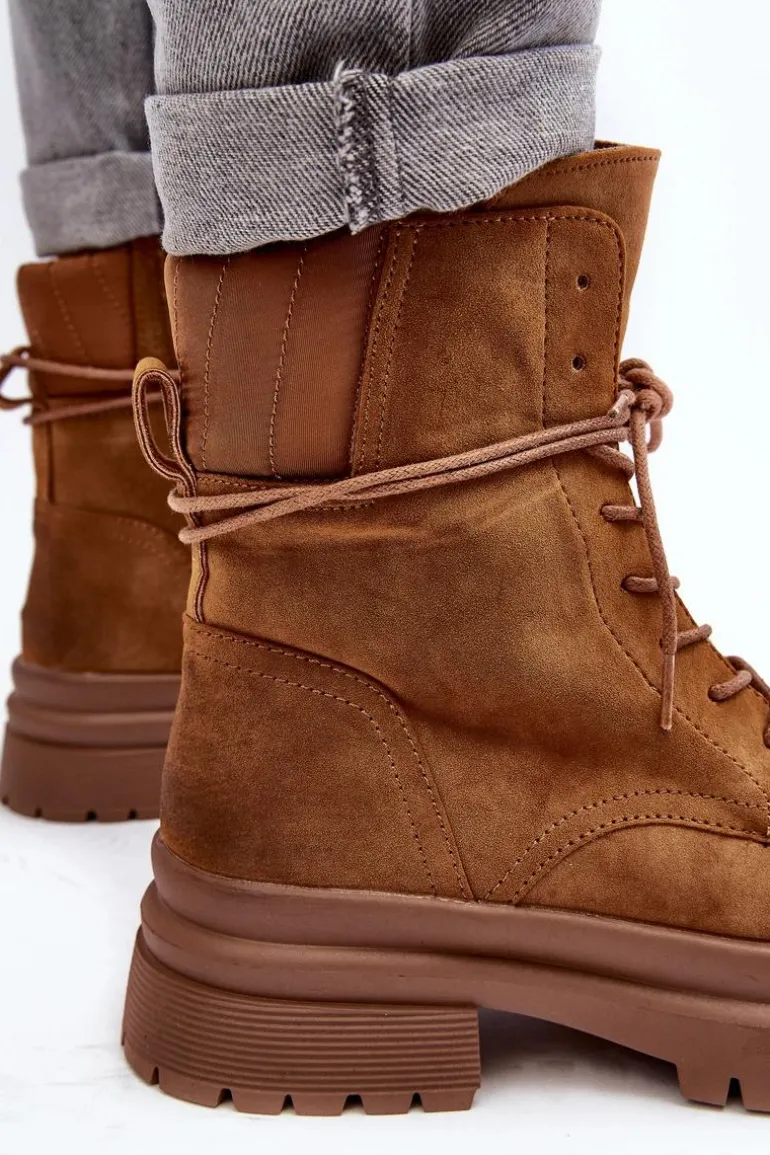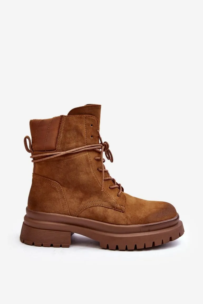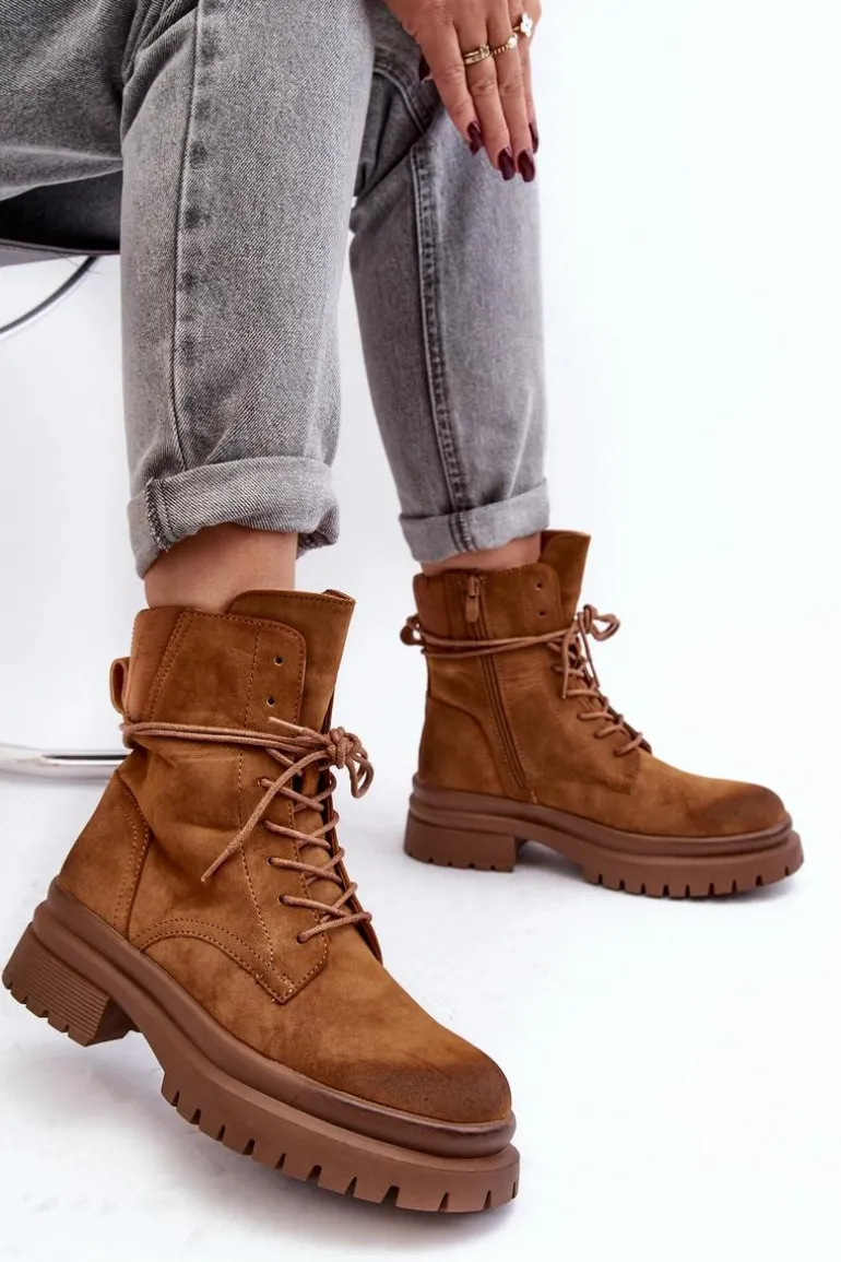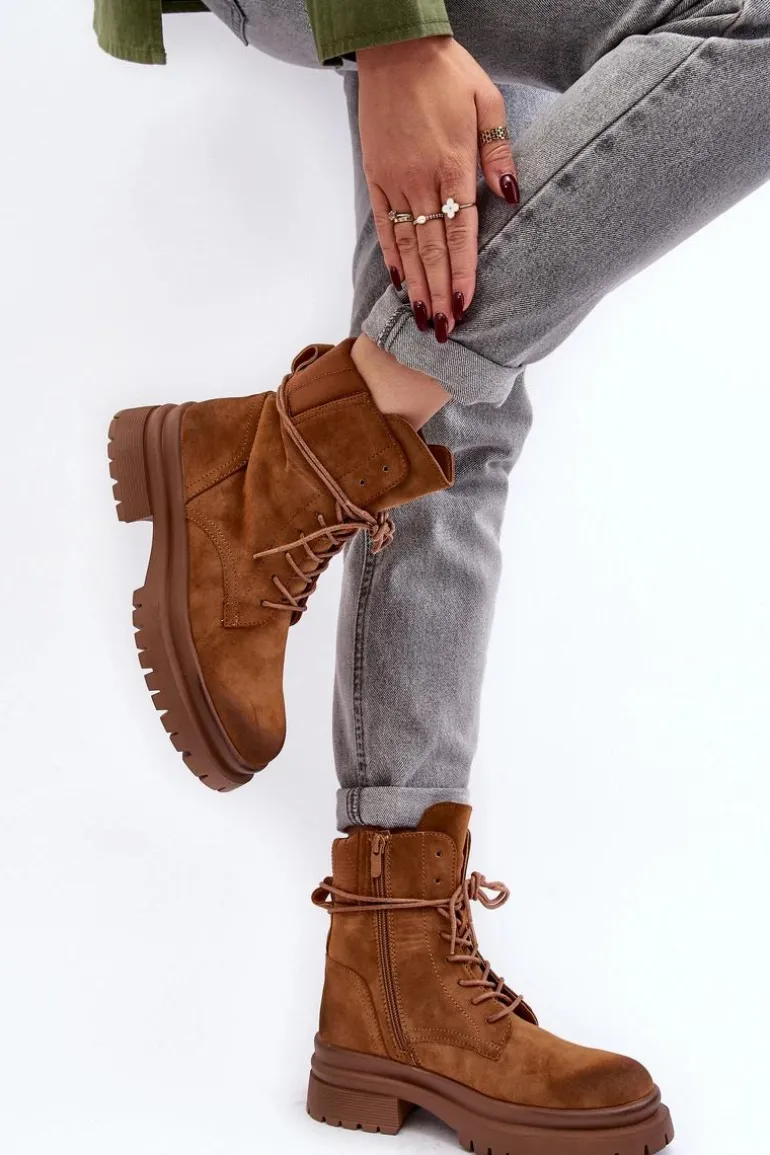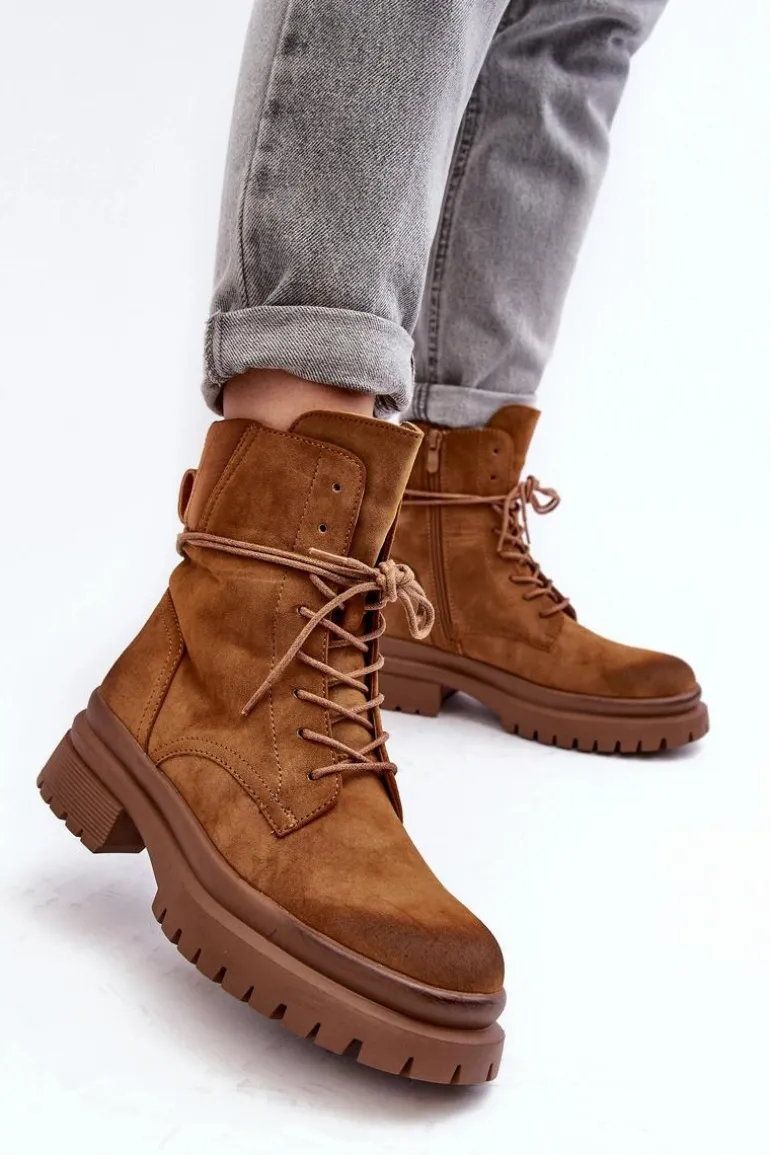 Damskie trapery wykonane z eko skóry. Osadzone na płaskim obcasie i platformie. Noski zaokrąglone. Model ten zapinany jest na suwak z boku oraz dodatkowo posiada sznurowanie. Usztywniony zapiętek zwiększy stabilizacje stopy. Koniecznie powinnaś je mieć! Przy wyborze rozmiaru prosimy sugerować się tabelą rozmiarów.