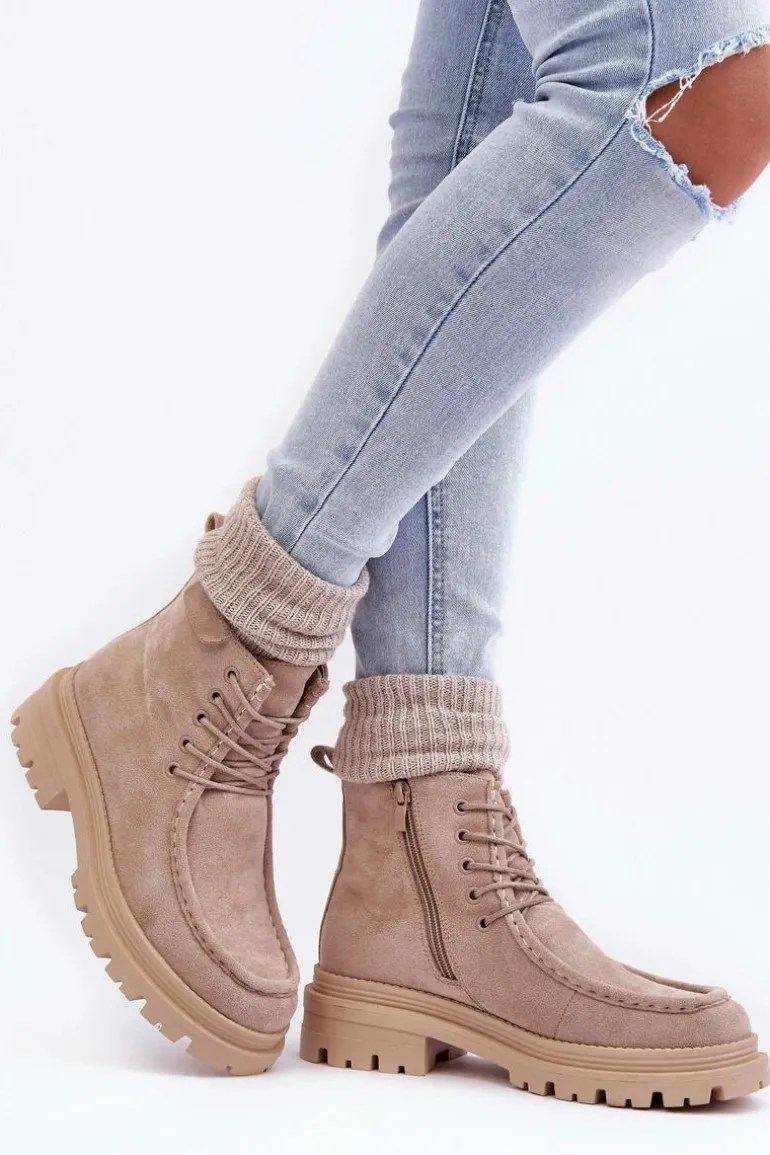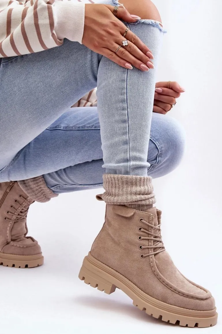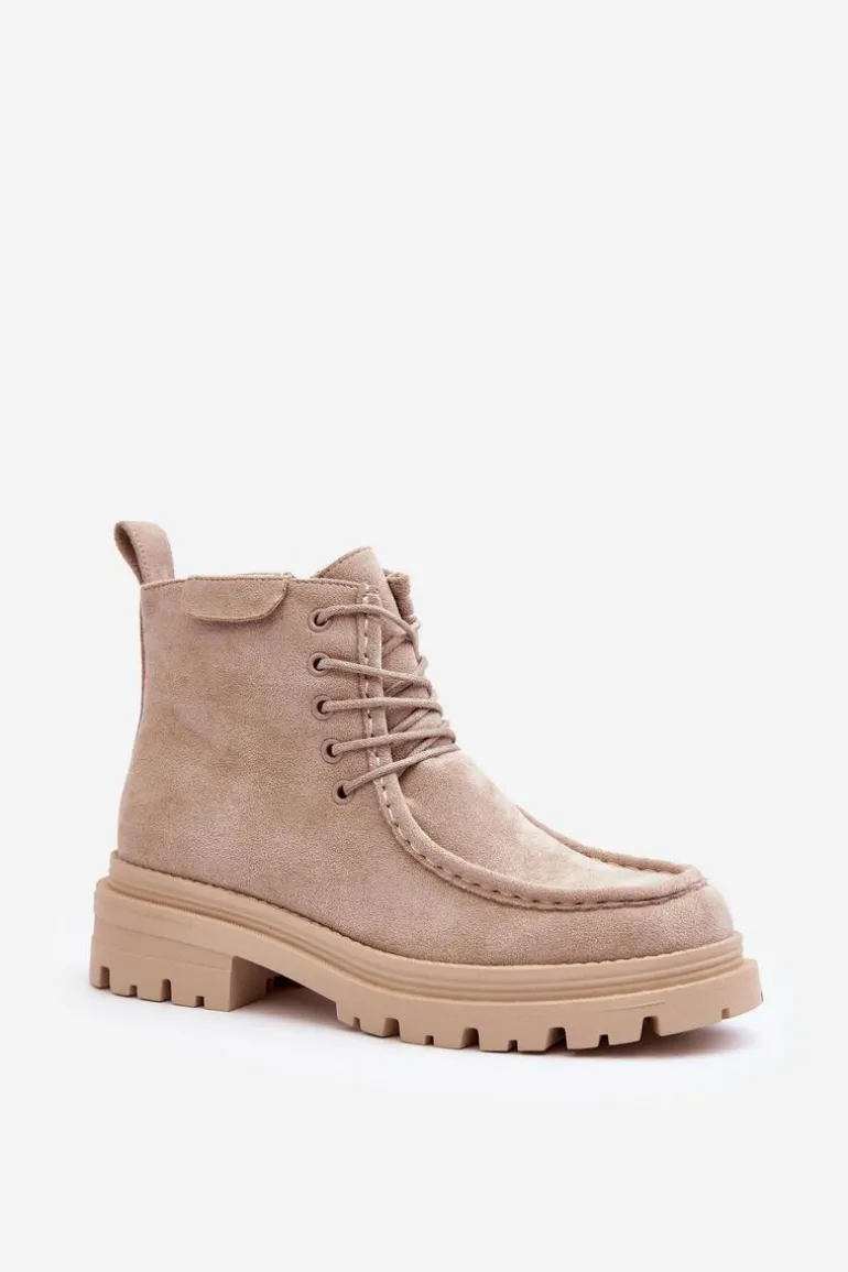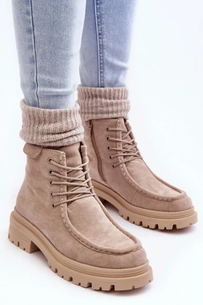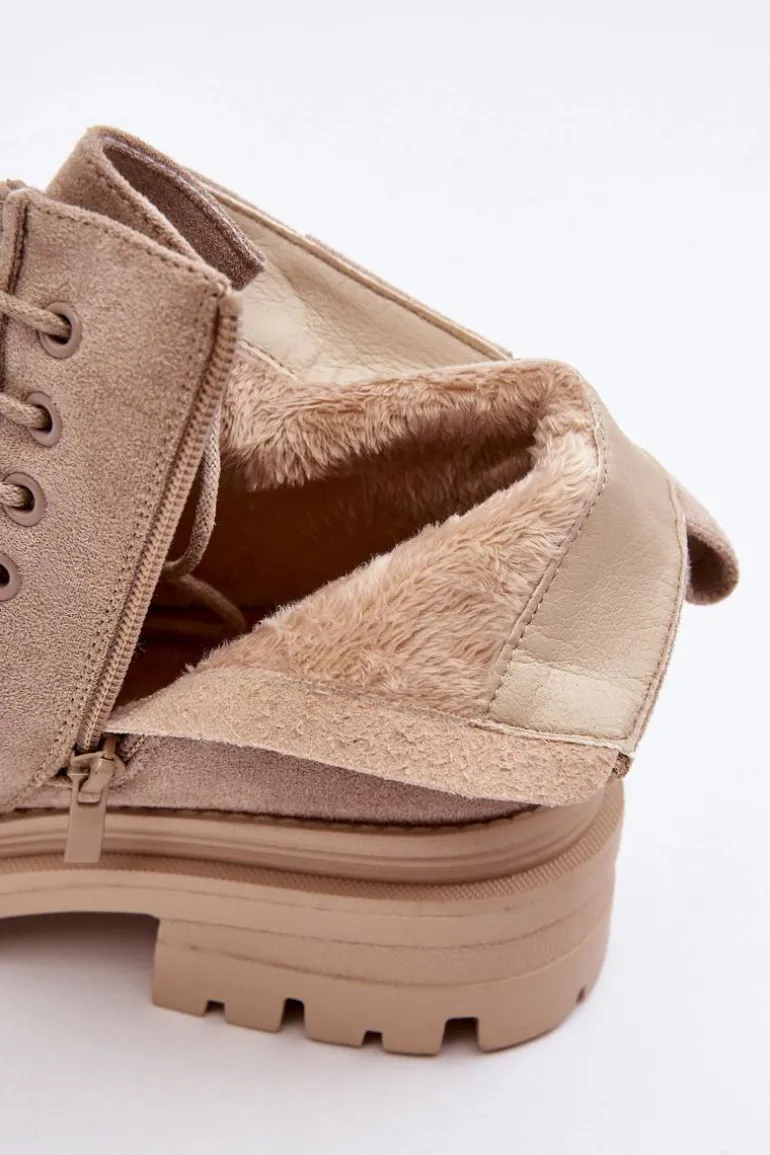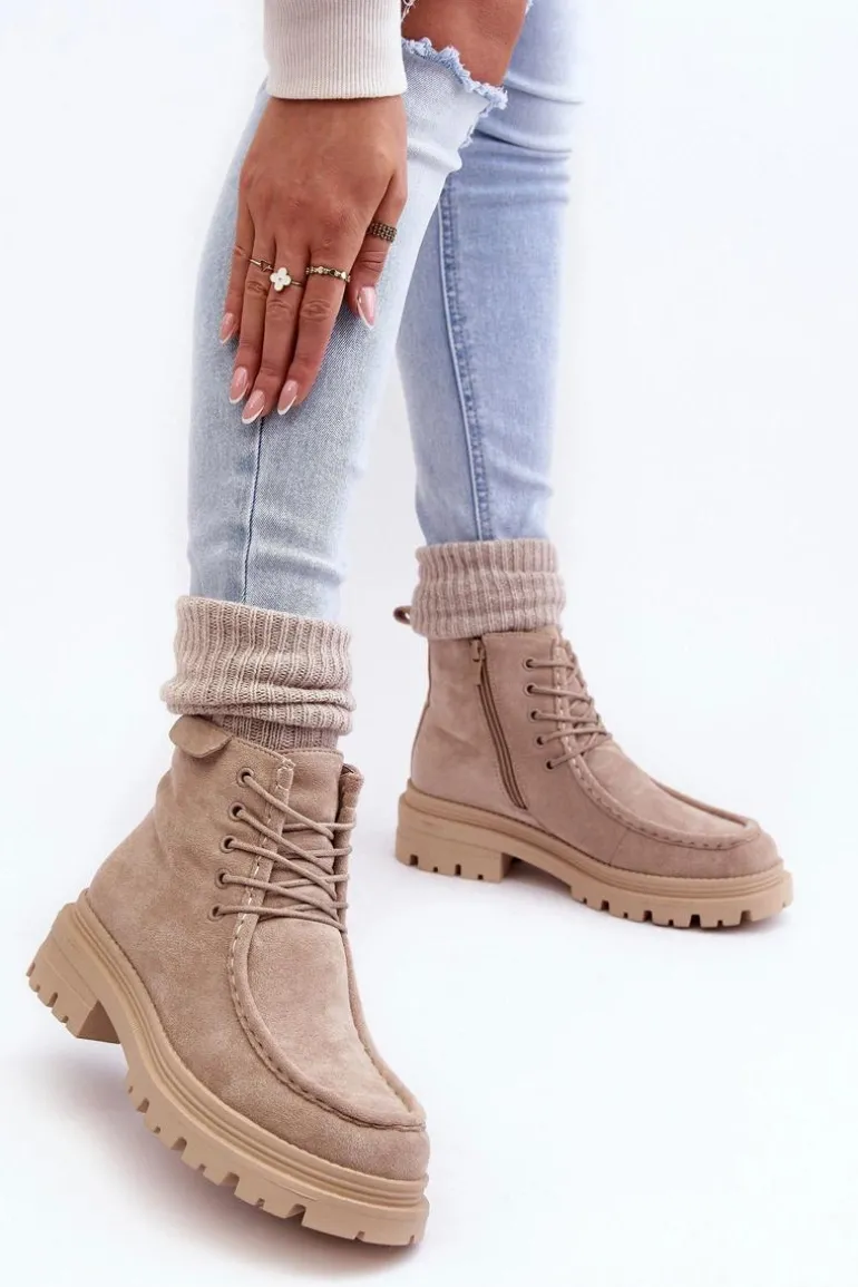 Trapery damskie wykonane z eko zamszu. Zapinane na suwak z boku. Wewnątrz ocieplone kocem obuwniczym. Płaski obcas oraz platforma zapewnia stabilność na każdym kroku. Z przodu dodatkowe sznurowanie. Noski zaokrąglone. Zapiętek usztywniony. Buty idealnie sprawdzą się w zimowe dni! Przy wyborze rozmiaru prosimy sugerować się tabelą rozmiarów.