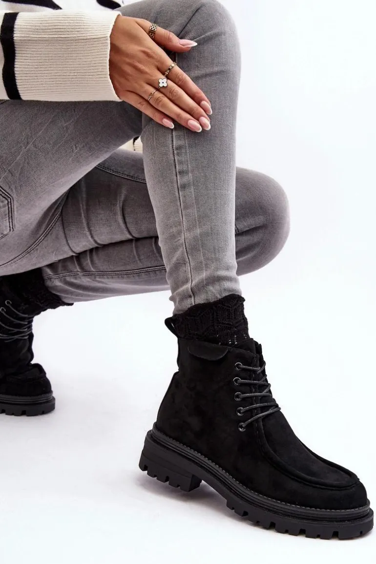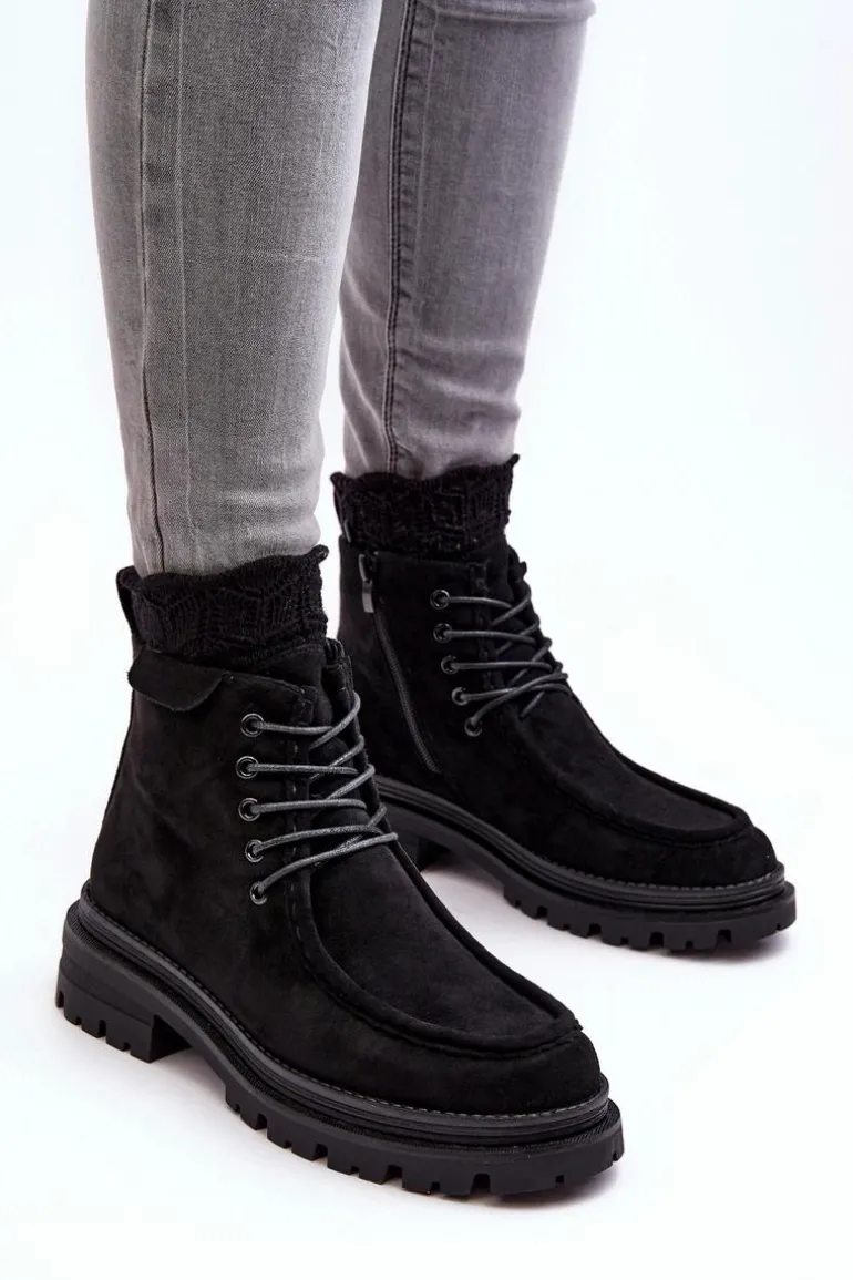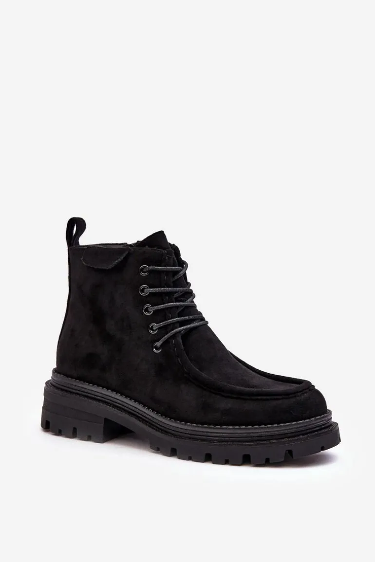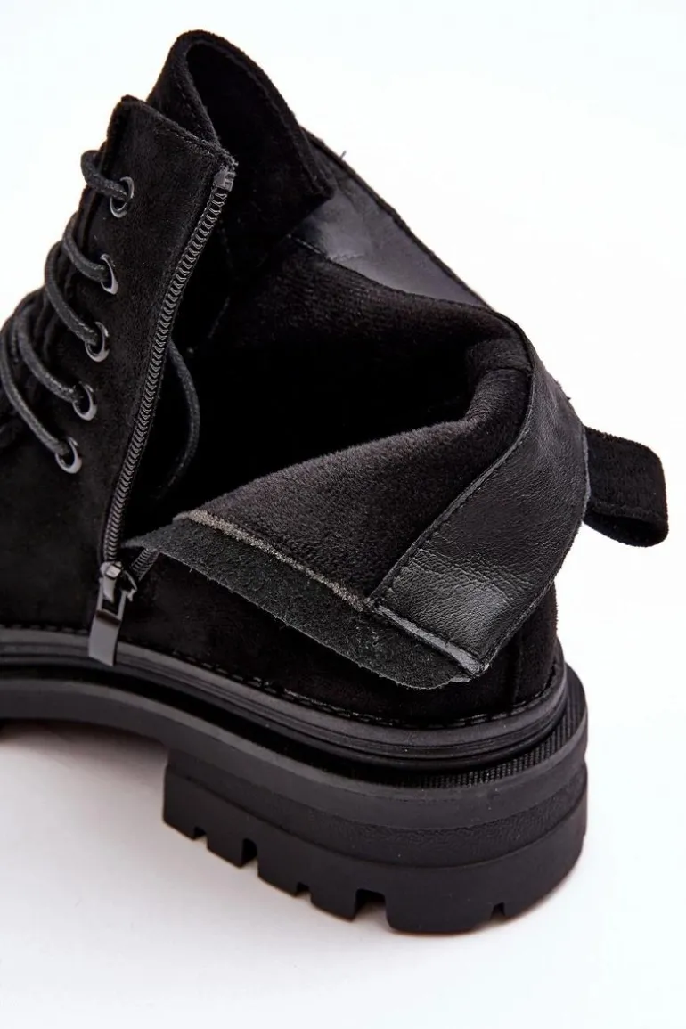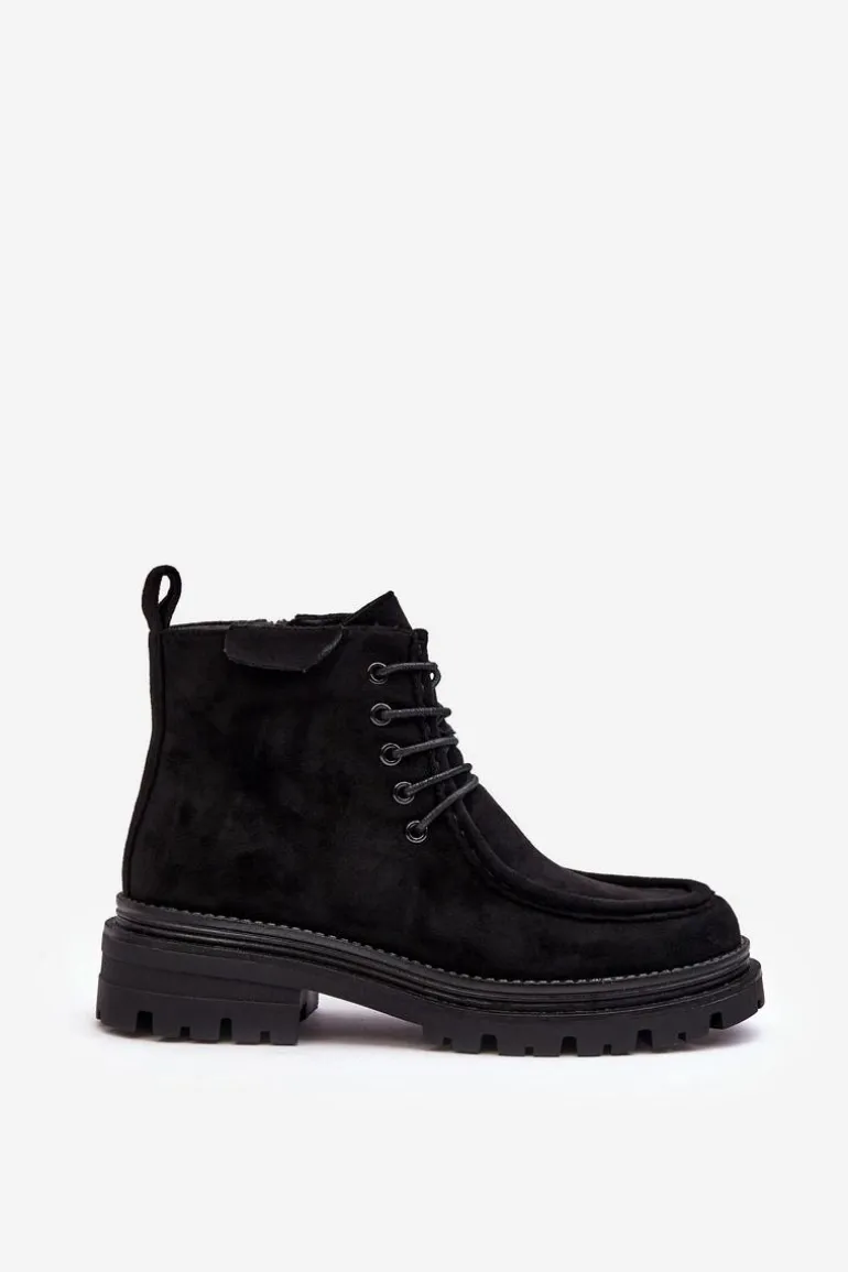 Trapery damskie wykonane z eko zamszu. Zapinane na suwak z boku. Wewnątrz ocieplone kocem obuwniczym. Płaski obcas oraz platforma zapewnia stabilność na każdym kroku. Z przodu dodatkowe sznurowanie. Noski zaokrąglone. Zapiętek usztywniony. Buty idealnie sprawdzą się w zimowe dni! Przy wyborze rozmiaru prosimy sugerować się tabelą rozmiarów.