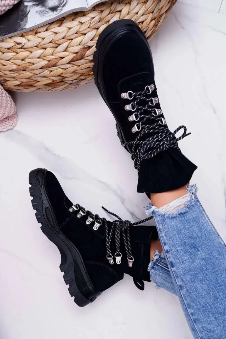 Trapery stały się nieodłącznym elementem jesienno-zimowych stylizacji. Jednym z trendów tego sezonu będą te wspaniałe buty na grubej podeszwie. Cholewka to eko-zamsz w klasycznym czarnym kolorze. Wnętrze pokryte kocem obuwniczym z krótkim włosiem, które zapewni nam komfort w każdej sytuacji. Przy wyborze rozmiaru prosimy sugerować się tabelą rozmiarów.