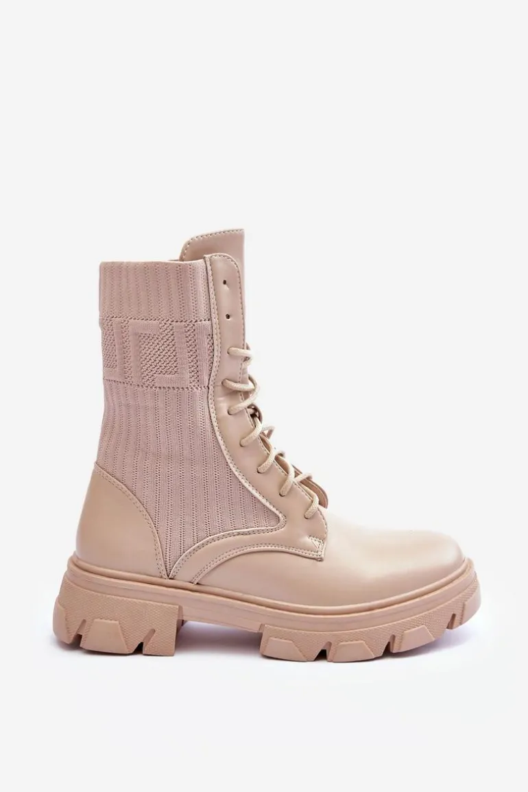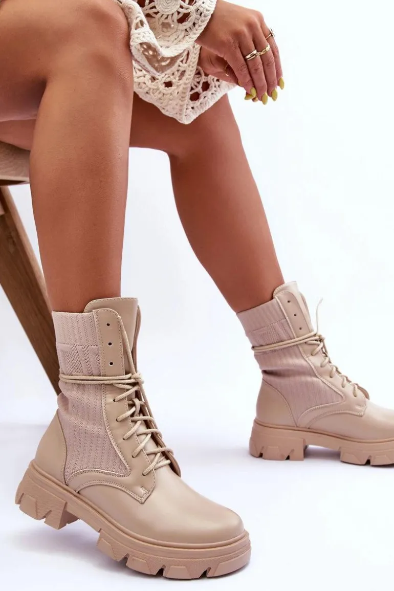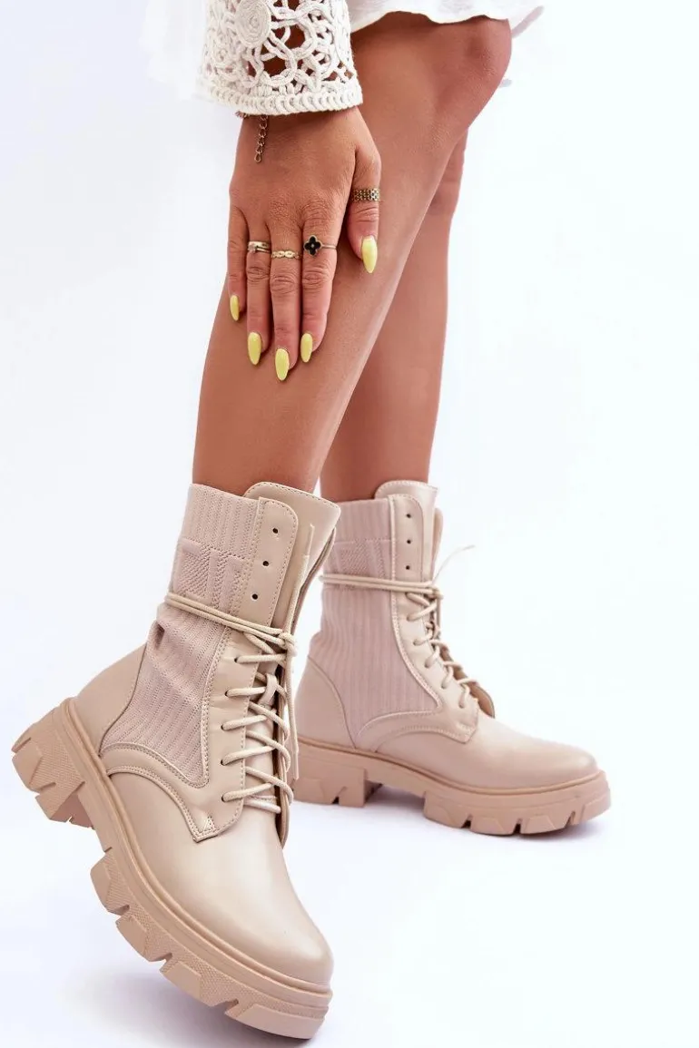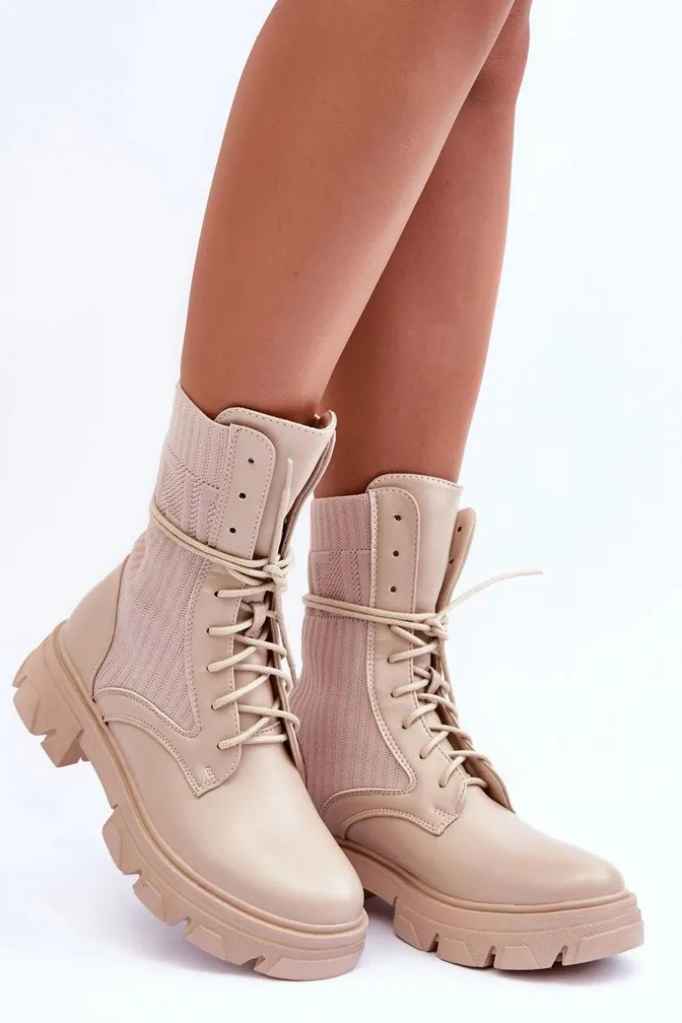 Damskie botki na płaskim, masywnym obcasie i platformie świetnie sprawdzą się do wielu stylizacji! Wykonane z połączenia elastycznej tkaniny oraz eko skóry. Model klasycznie sznurowany pozwoli na odpowiednie dopasowanie obuwia do tęgości nogi. Dodatkowo botki te posiadają usztywniany zapiętek. Materiałowa wkładka zapewni komfort podczas użytkowania. Przy wyborze rozmiaru prosimy sugerować się tabelą rozmiarów.