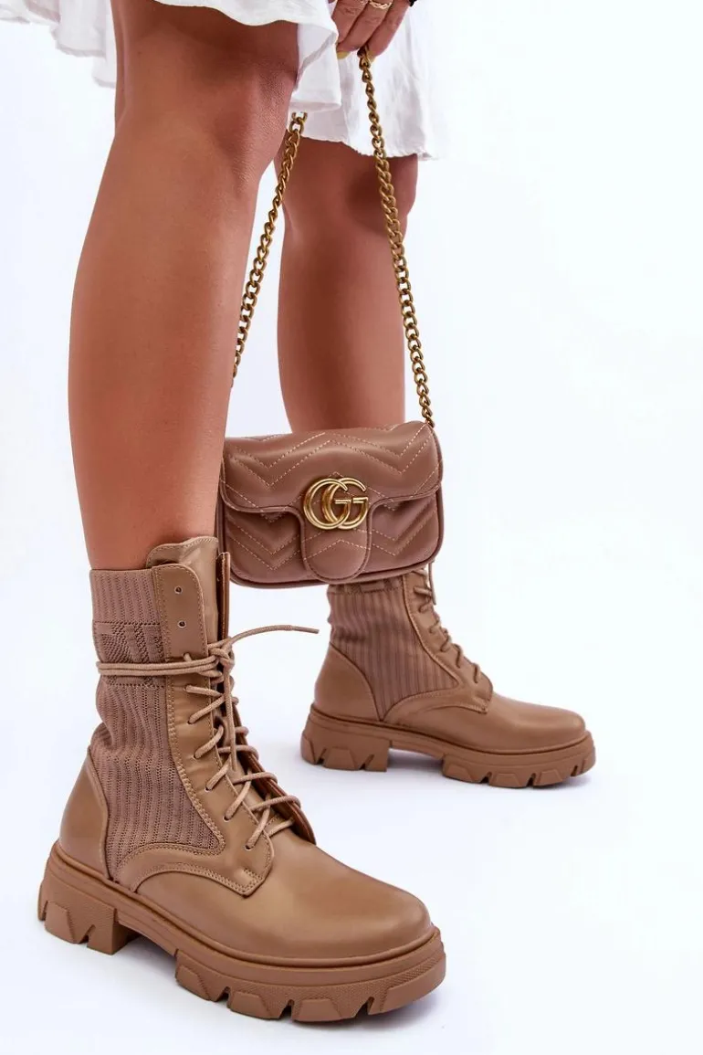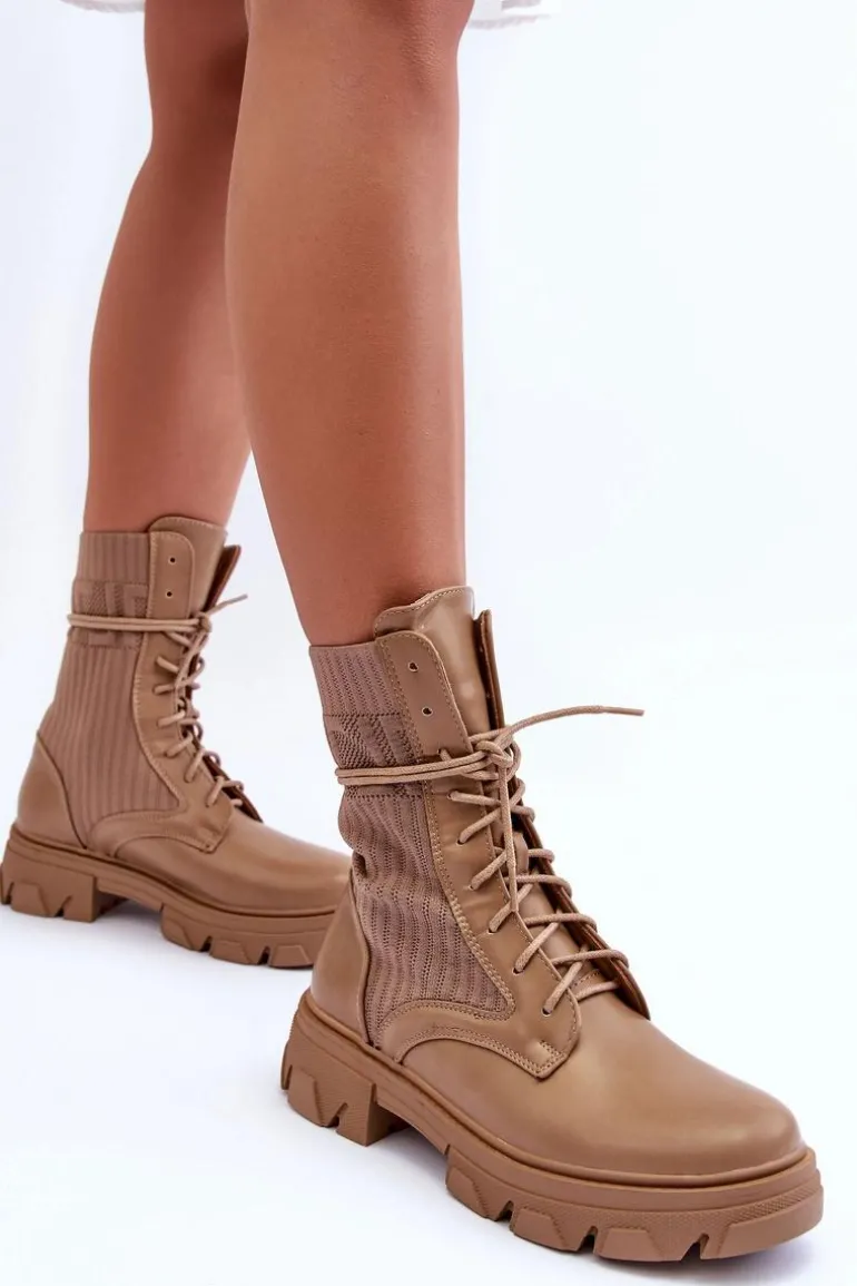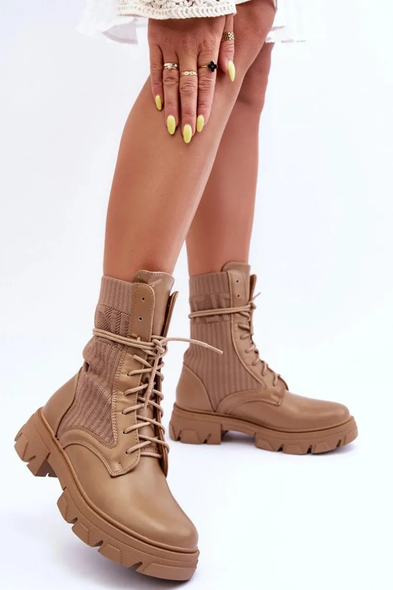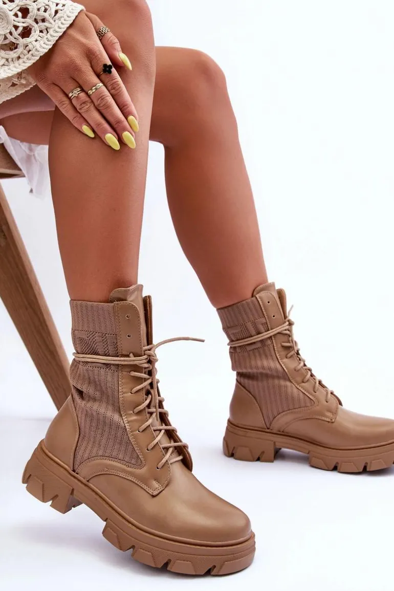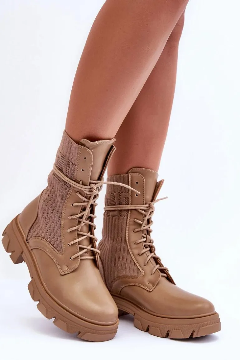 Damskie botki na płaskim, masywnym obcasie i platformie świetnie sprawdzą się do wielu stylizacji! Wykonane z połączenia elastycznej tkaniny oraz eko skóry. Model klasycznie sznurowany pozwoli na odpowiednie dopasowanie obuwia do tęgości nogi. Dodatkowo botki te posiadają usztywniany zapiętek. Materiałowa wkładka zapewni komfort podczas użytkowania. Przy wyborze rozmiaru prosimy sugerować się tabelą rozmiarów.