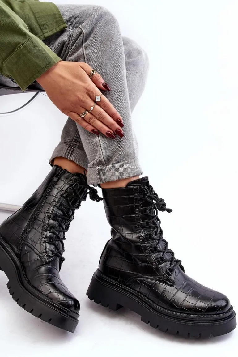 Botki damskie wykonane z eko skóry. Osadzone na płaskim obcasie oraz grubej podeszwie, co gwarantuje stabilność i komfort noszenia. Zamek z boku cholewki oraz dodatkowe sznurowanie, zapewnia idealne dopasowanie. Noski zaokrąglone. Środek ocieplony kocem obuwniczym. Doskonale sprawdzą się w różnych jesienno-zimowych stylizacjach! Przy wyborze rozmiaru prosimy sugerować się tabelą rozmiarów.