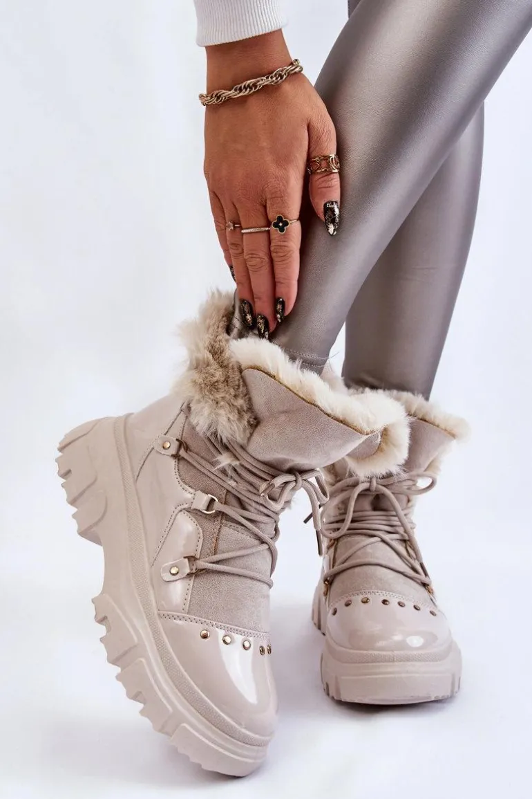 Świetne botki na płaskim obcasie i platformie z bieżnikiem będą pasować do wielu stylizacji! Wykonane z połączenia eko zamszu oraz eko skóry. Botki posiadają wewnątrz ocieplenie w postaci futerka. Model wsuwany, z dodatkowym sznurowaniem. Dodatkowo z przodu zostały ozdobione ćwiekami. Koniecznie powinnaś mieć ten model w swojej szafie! Przy wyborze rozmiaru prosimy sugerować się tabelą rozmiarów.