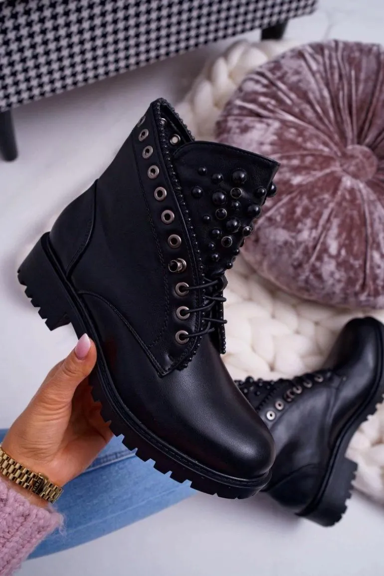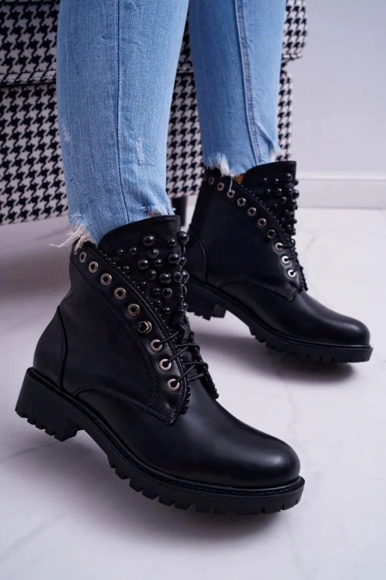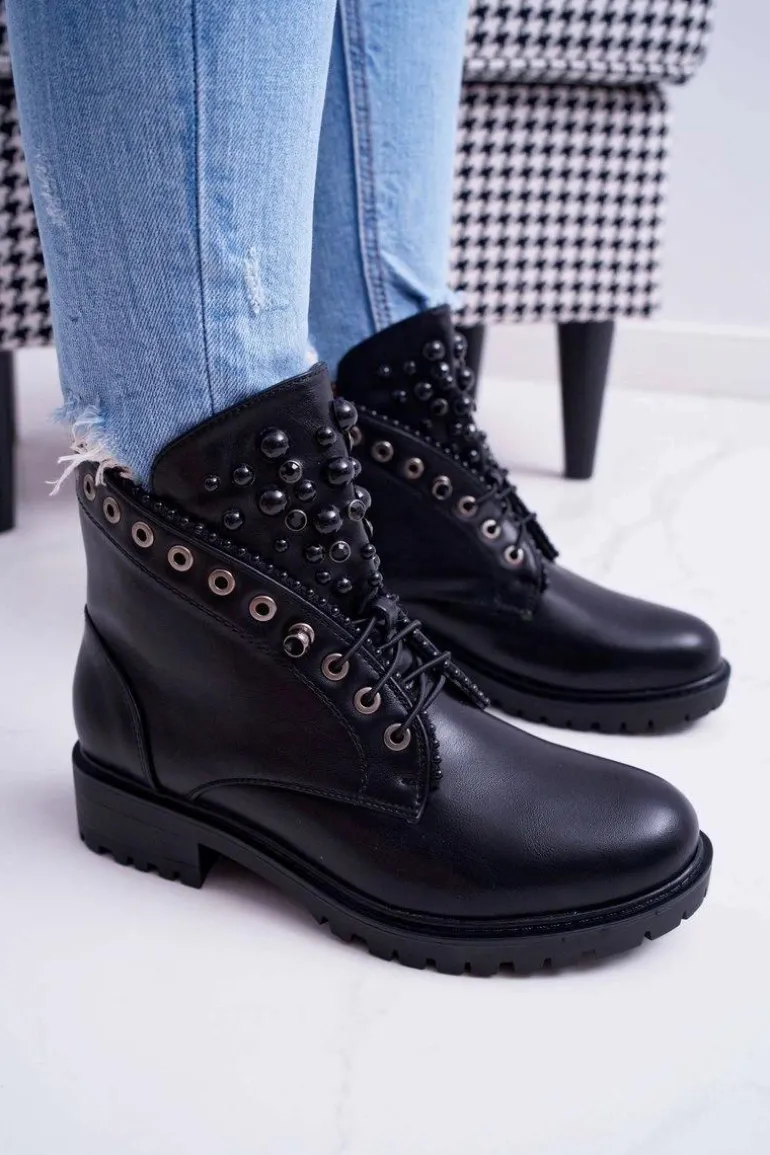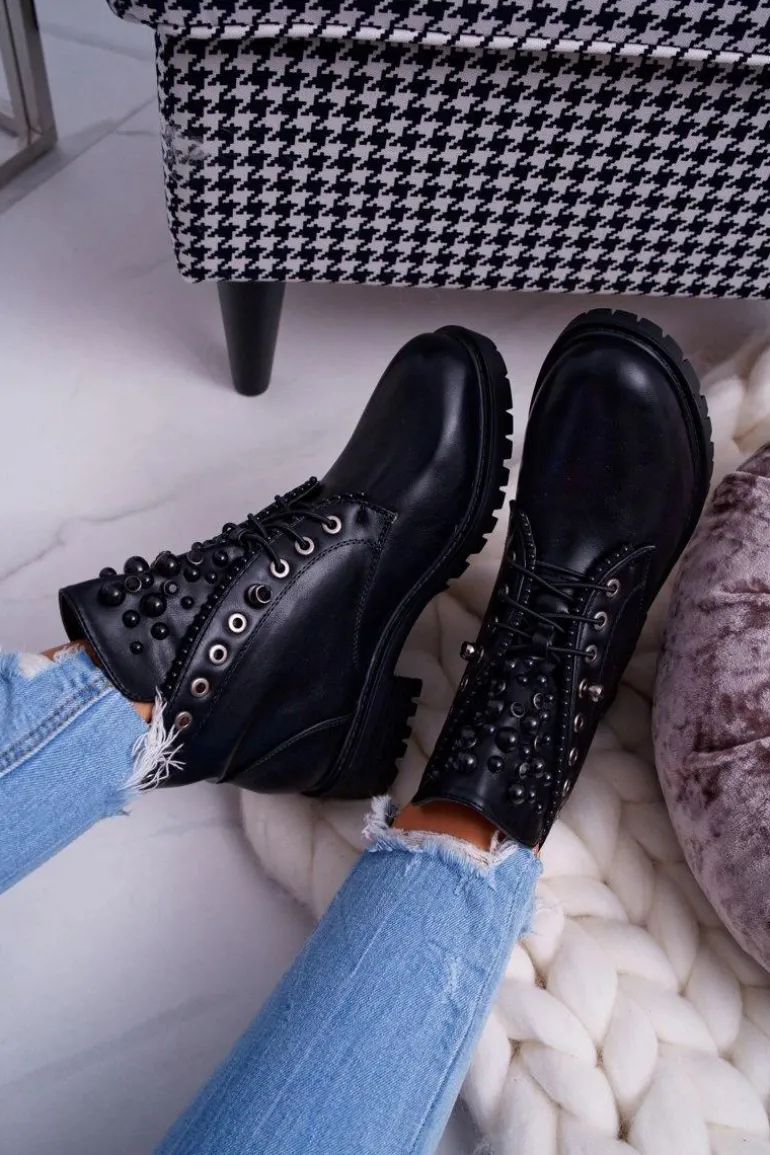 Damskie Botki Z Perełkami Ciepłe Czarne Memer