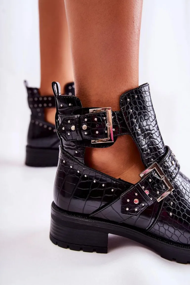 Wyjątkowe botki damskie z wycięciami po bokach cholewki. Wyglądają bardzo efektownie, dzięki sprzączkom na boku oraz zdobieniom w postaci ćwieków. Z wierzchu zostały wykonane ze skóry ekologicznej. Posiadają usztywniany zapiętek. Model osadzony na delikatnej platformie i płaskim obcasie. Koniecznie powinnaś je mieć! Nie czekaj dłużej i kup już teraz! Przy wyborze rozmiaru prosimy sugerować się tabelą rozmiarów.