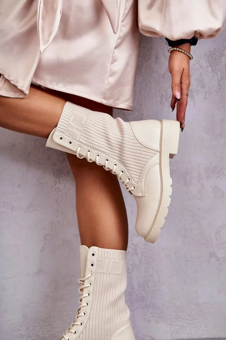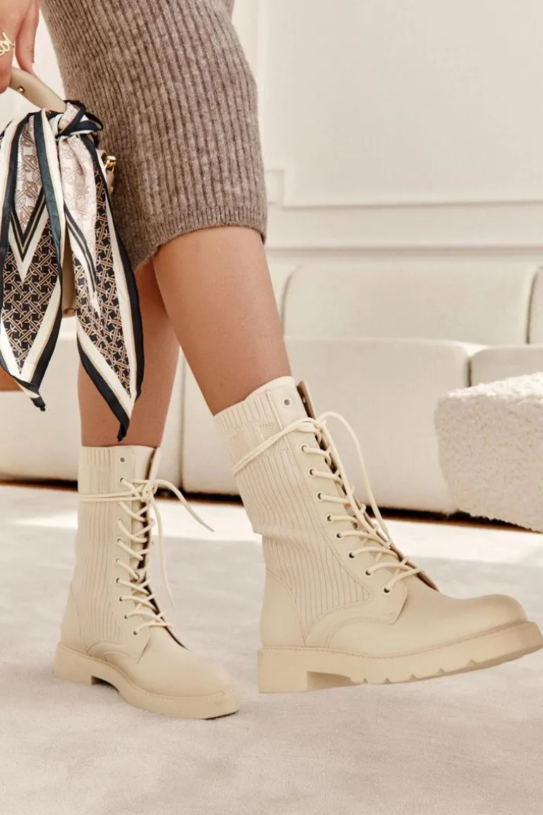 Klasyczne botki z wyższą cholewką wykonaną z połączenia eko skóry oraz elastycznego, prążkowanego materiału. Model klasycznie sznurowany. Botki zostały osadzone na płaskim obcasie i delikatnej platformie. Zapiętek jest usztywniany. Wkładka w tych butach jest ocieplana kocem obuwniczym. Świetny model do wielu stylizacji! Przy wyborze rozmiaru prosimy sugerować się tabelą rozmiarów.