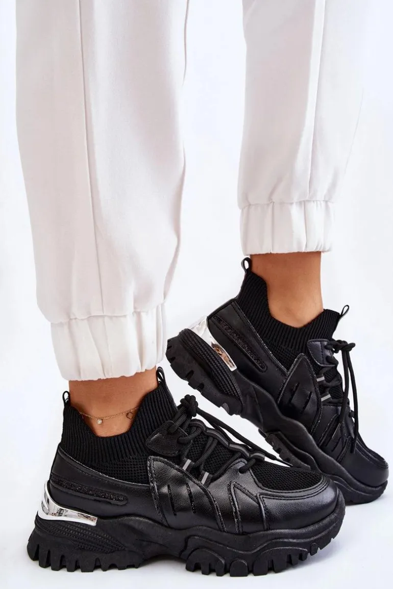 Buty sportowe zostały wykonane z połączenia eko skóry oraz materiału tekstylnego. Model wsuwany z dodatkowym sznurowaniem. Buty zostały osadzone na masywnej platformie z płaskim obcasem i żłobieniami. Miękka wkładka zapewni komfortowe użytkowanie obuwia. Koniecznie powinnaś je mieć! Przy wyborze rozmiaru prosimy sugerować się tabelą rozmiarów.