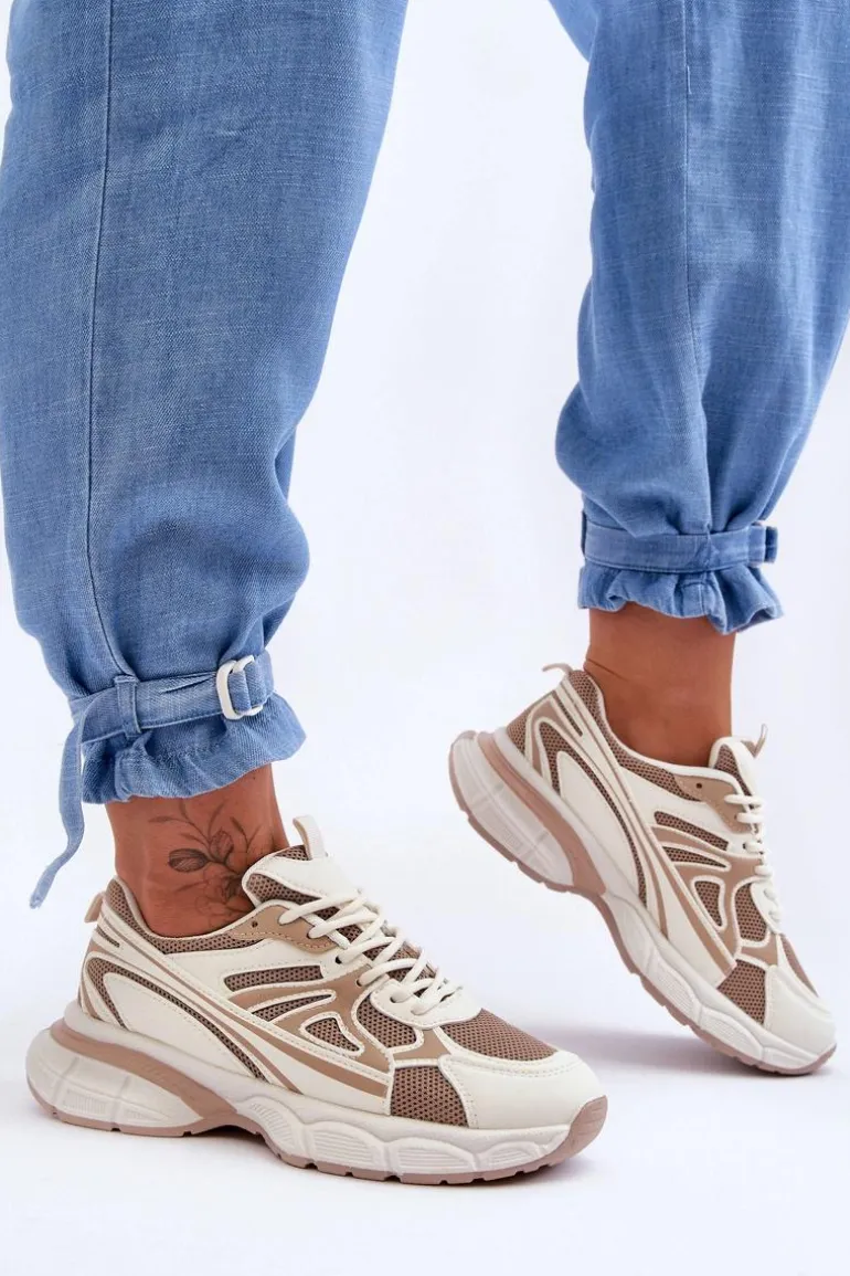 Damskie buty sportowe zostały wykonane z połączenia eko skóry oraz siateczkowego materiału tekstylnego. Model klasycznie sznurowany pozwoli na odpowiednie dopasowanie obuwia do tęgości nogi. Buty zostały osadzone na masywnej platformie z płaskim obcasem i antypoślizgową podeszwą. Wkładka z tkaniny zapewni komfortowe użytkowanie obuwia. Te modne sneakersy na pewno sprawdzą się w wielu stylizacjach! Przy wyborze rozmiaru prosimy sugerować się tabelą rozmiarów.