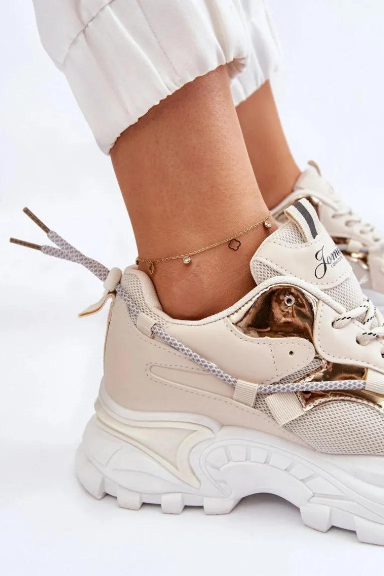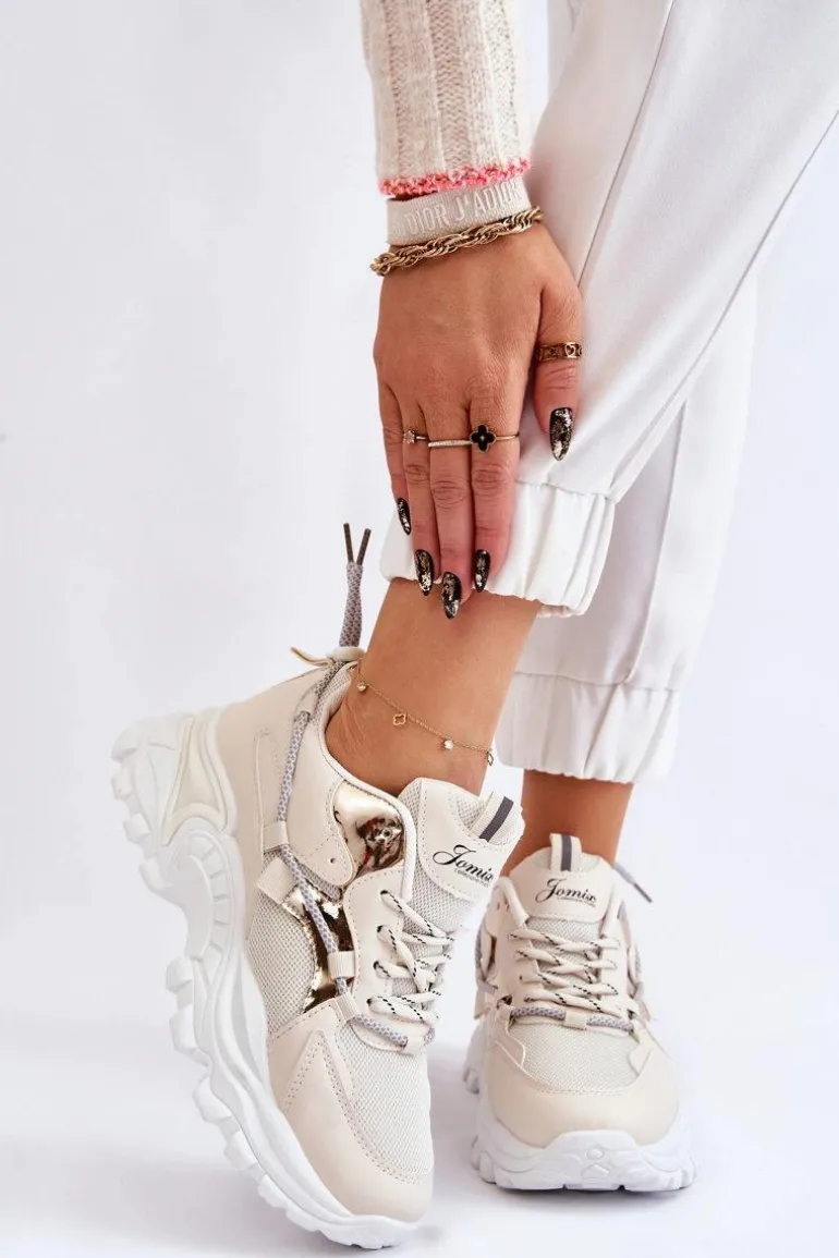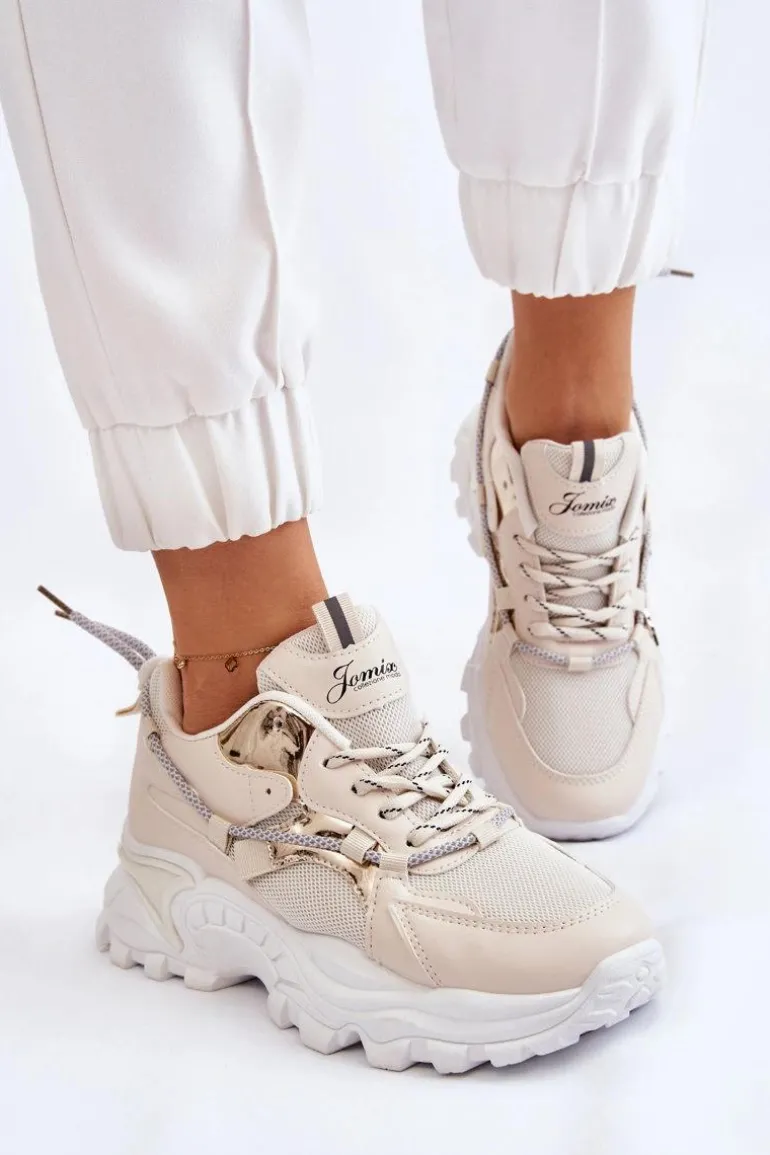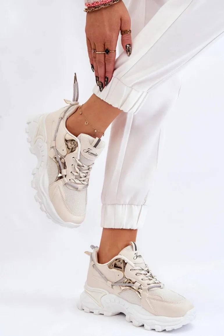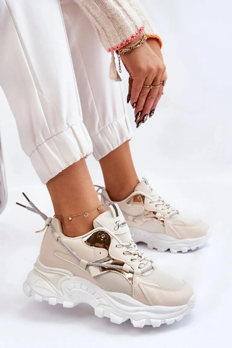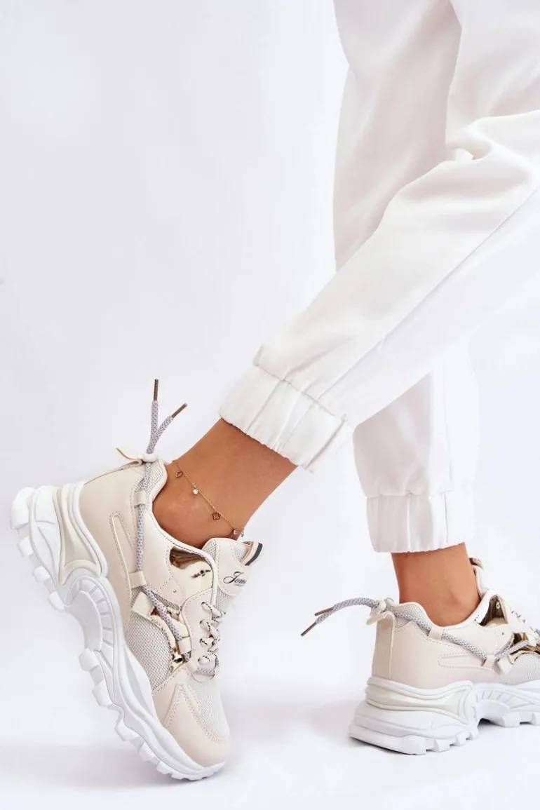 Damskie buty sportowe na masywnej podeszwie i płaskim obcasie ze żłobieniami. Model klasycznie sznurowany. Buty sportowe zostały wykonane z połączenia siateczkowego materiału tekstylnego oraz eko skóry. Ten model świetnie będzie prezentować się z dresami, joggerami czy klasycznymi jeansami. Ozdobna sznurówka z tyłu cholewki jest zakończona ściągaczem. Przy wyborze rozmiaru prosimy sugerować się tabelą rozmiarów.