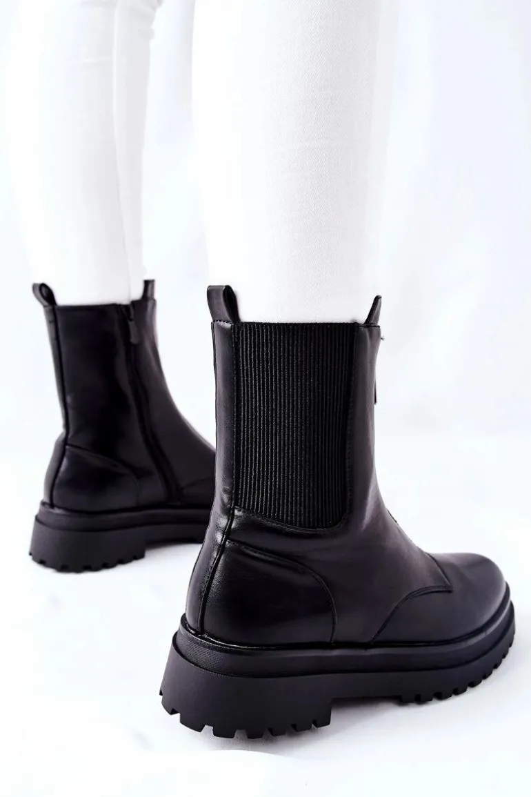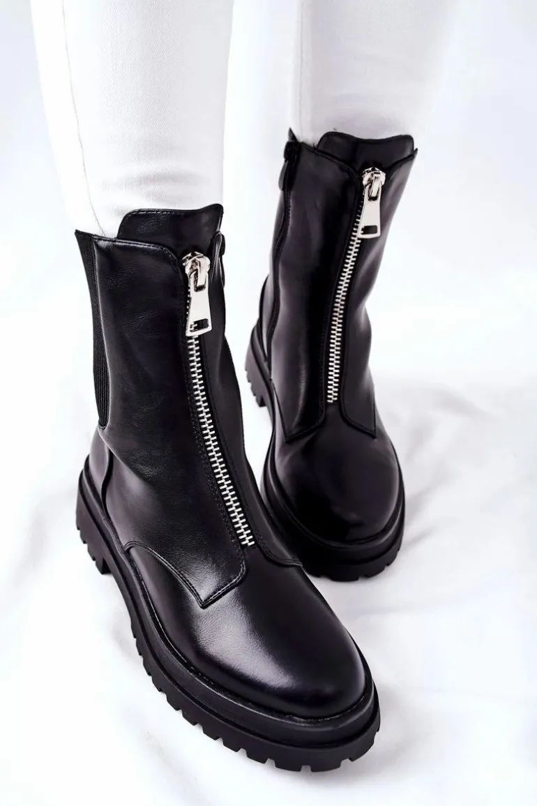 Botki damskie wykonane ze skóry ekologicznej. Wnętrze ocieplone jest miłym w dotyku kocem obuwniczym. Zakładanie ułatwi wszyty suwak, a idealne dopasowanie zapewni wszyta gumka na boku. Przy wyborze rozmiaru prosimy sugerować się tabelą rozmiarów.