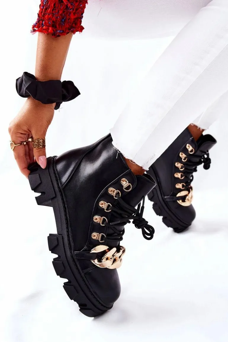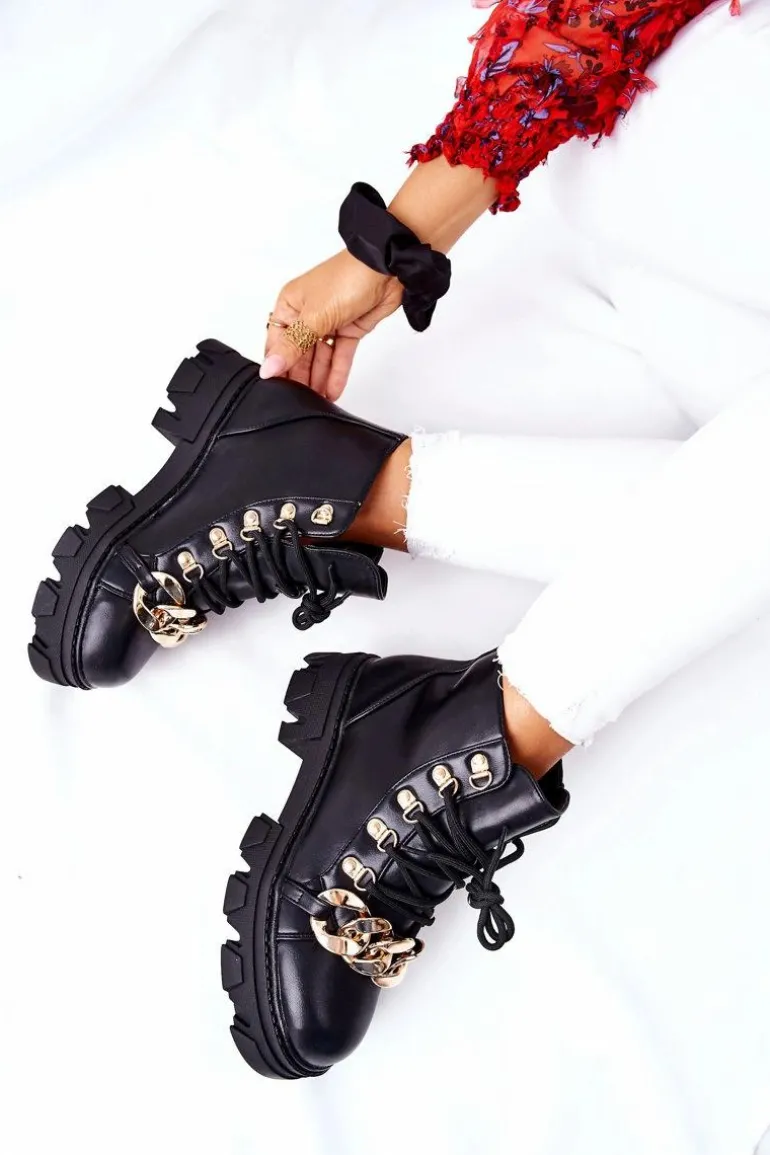 Buty, które są nieodłącznym elementem jesienno-zimowych stylizacji. Botki w całości zostały wykonane ze skóry ekologicznej. Gruba podeszwa oraz złote zdobienia w postaci łańcucha i złotych oczek, Wnętrze buta pokryte delikatnym ociepleniem w postaci koca obuwniczego. Przy wyborze rozmiaru prosimy sugerować się tabelą rozmiarów.
