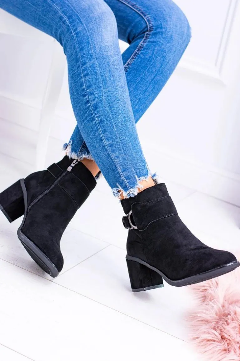 Damskie Czarne Botki Na Słupku Z Klamrą Zamsz Evoret