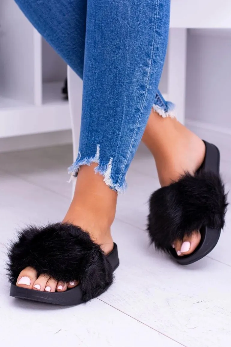 Damskie Czarne Klapki Z Dużym Futerkiem Fluffy
