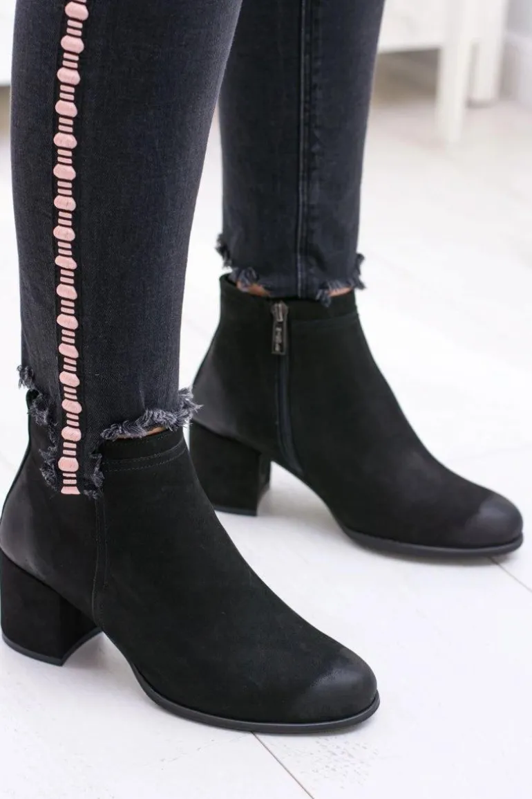 Klasyczne botki na słupku, wykonane w całości ze skór naturalnych typu nubuk! Wnętrze ocieplane kocem obuwniczym. Idealnie wkomponują się do codziennych jak i wieczorowych stylizacji. Wszyty na boku suwak ułatwi ich zakładanie. Nie przegap i kup teraz w wyjątkowej cenie!