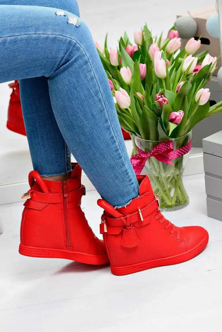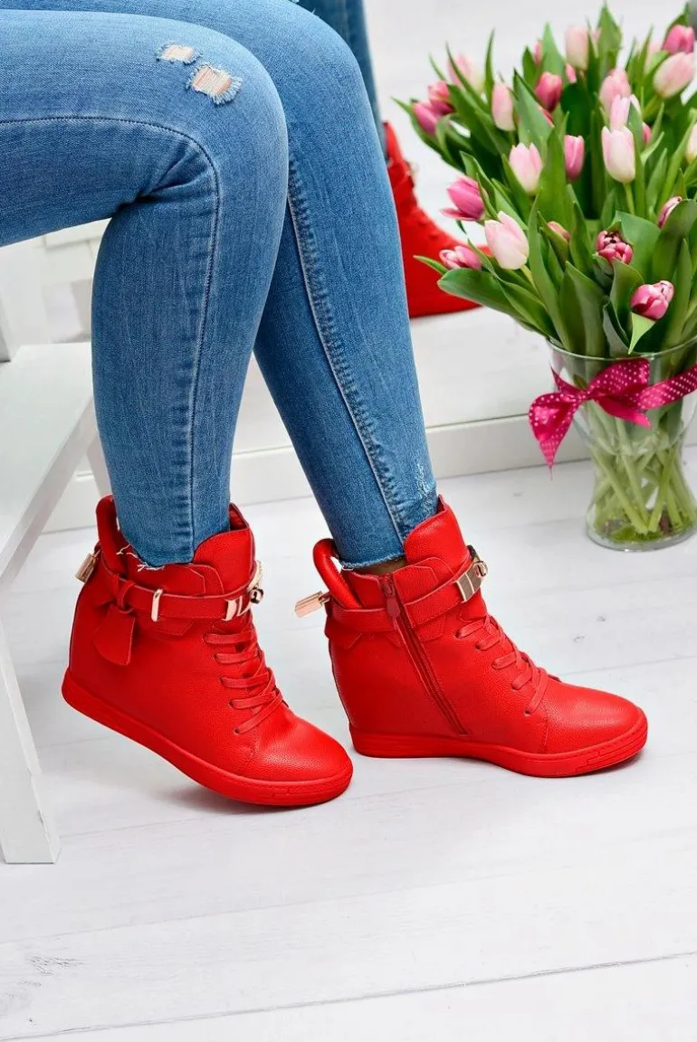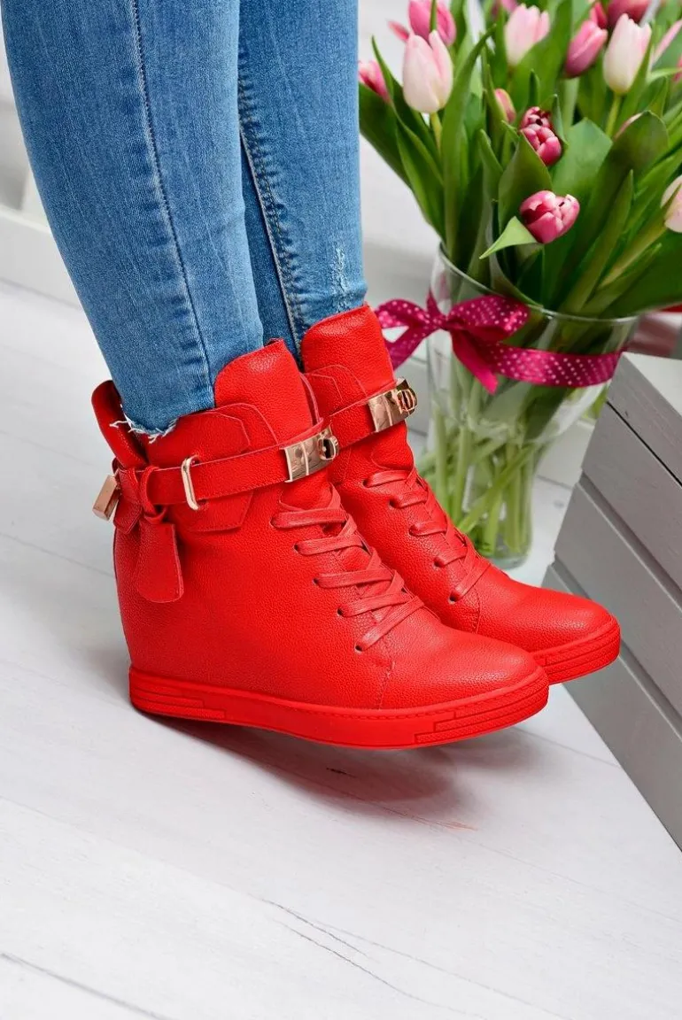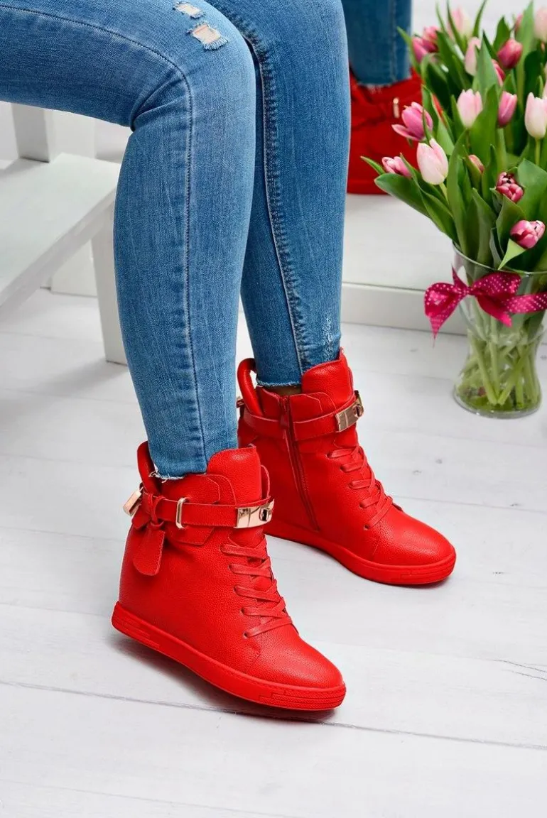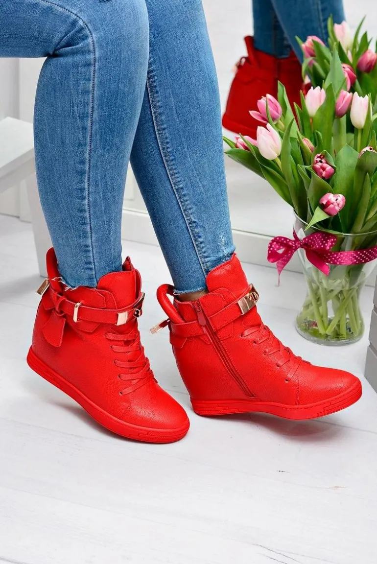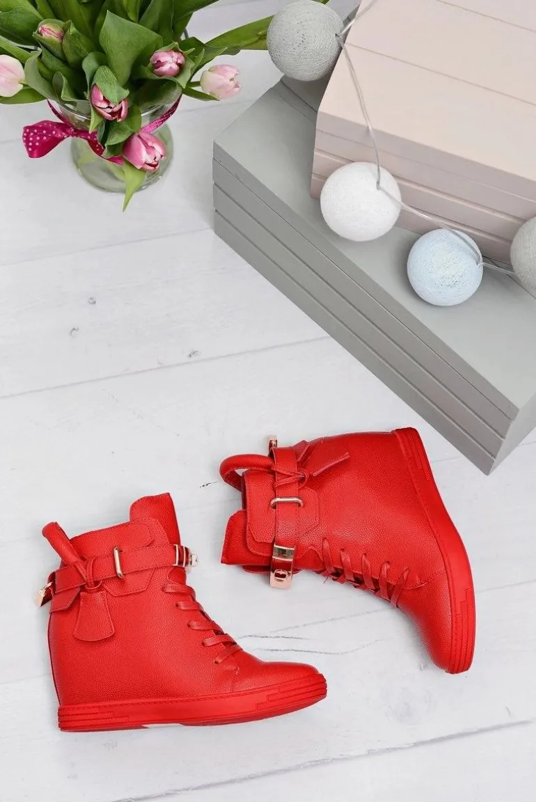 Damskie Czerwone Sneakersy Złota Kłódka Koturn Hudgens