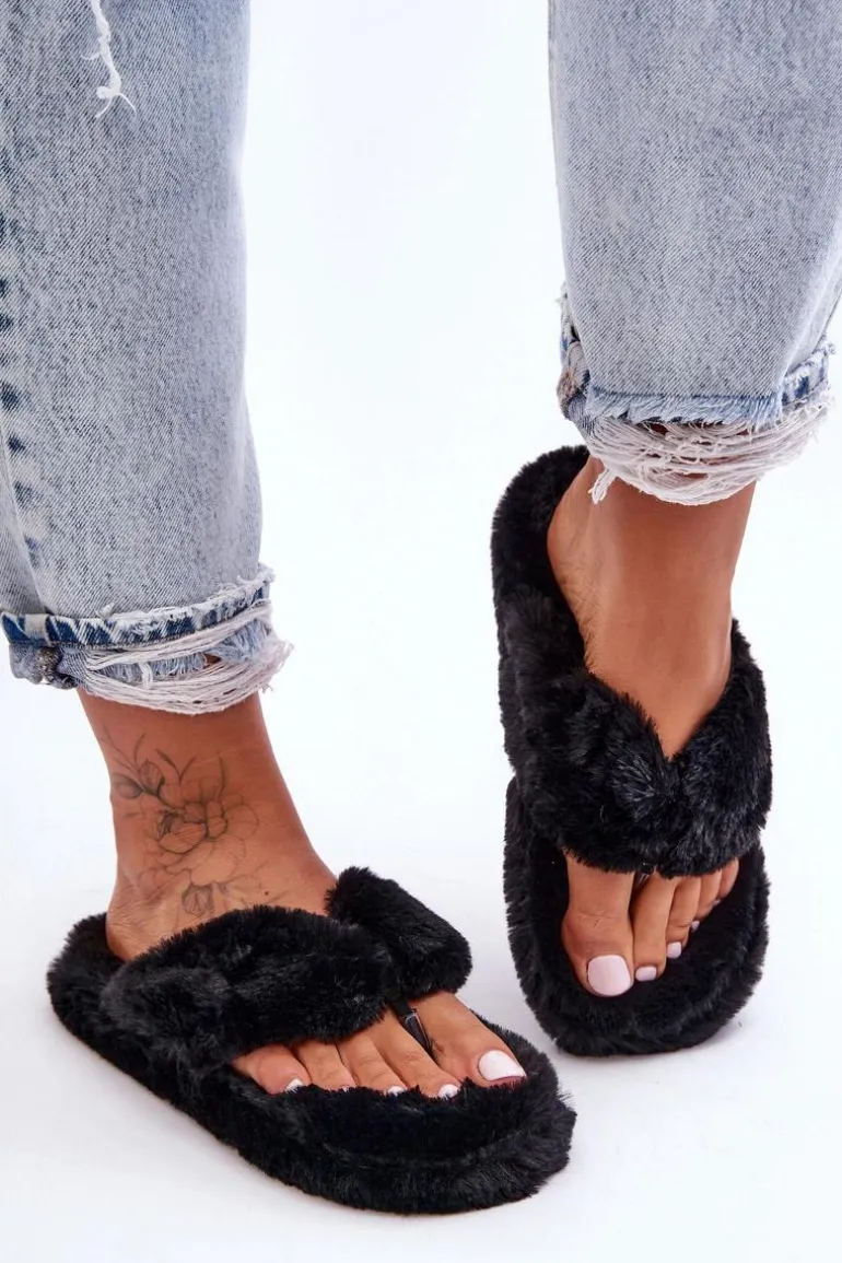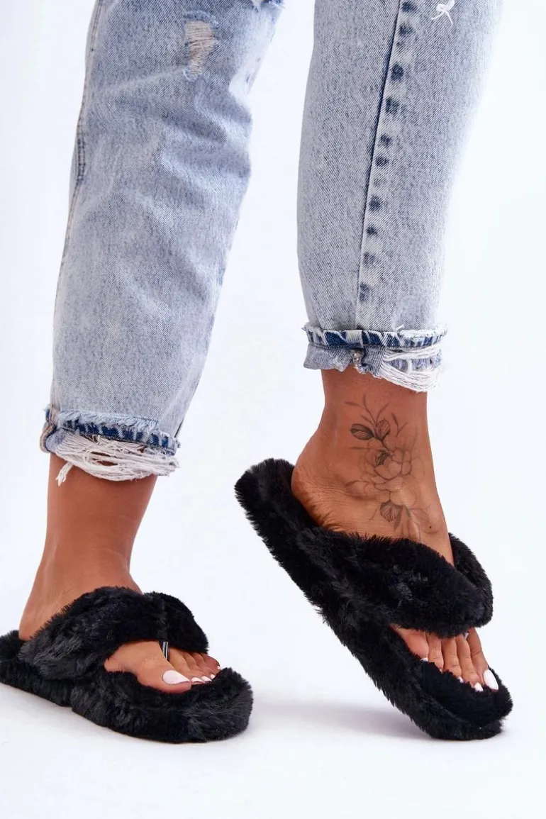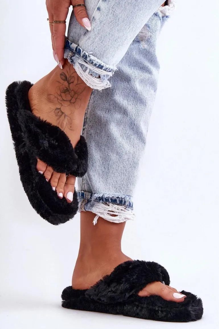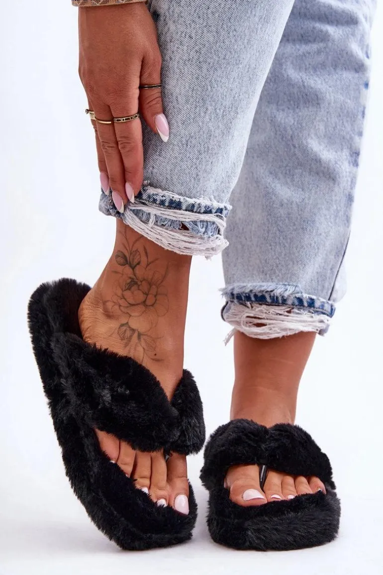 Damskie Futrzane Klapki Papcie Czarne Elma