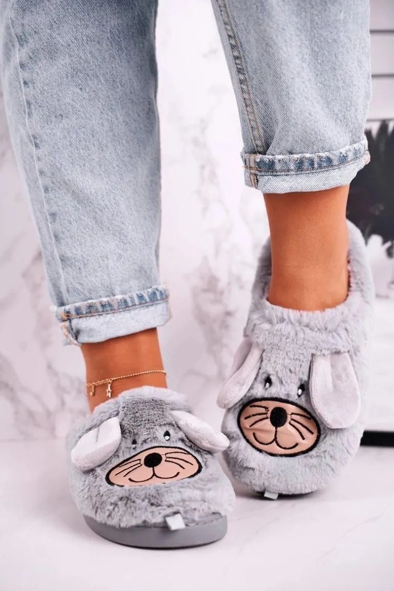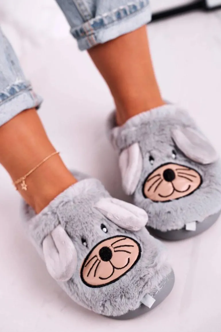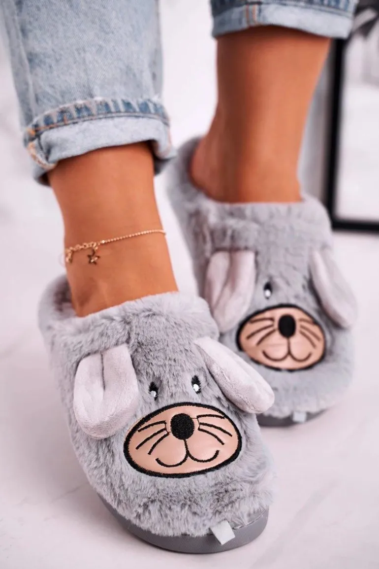Damskie Futrzane Papcie Myszki Szare Home Sweet Home