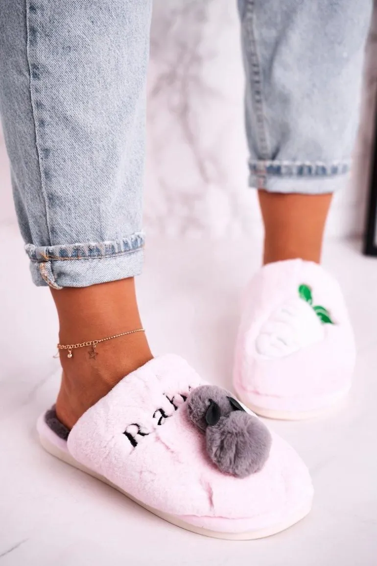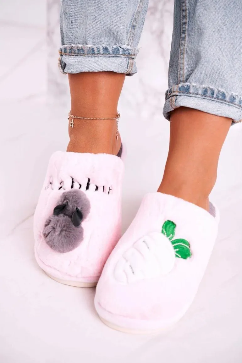 Damskie Futrzane Papcie z Królikiem I Marchewką Różowe Follow Me