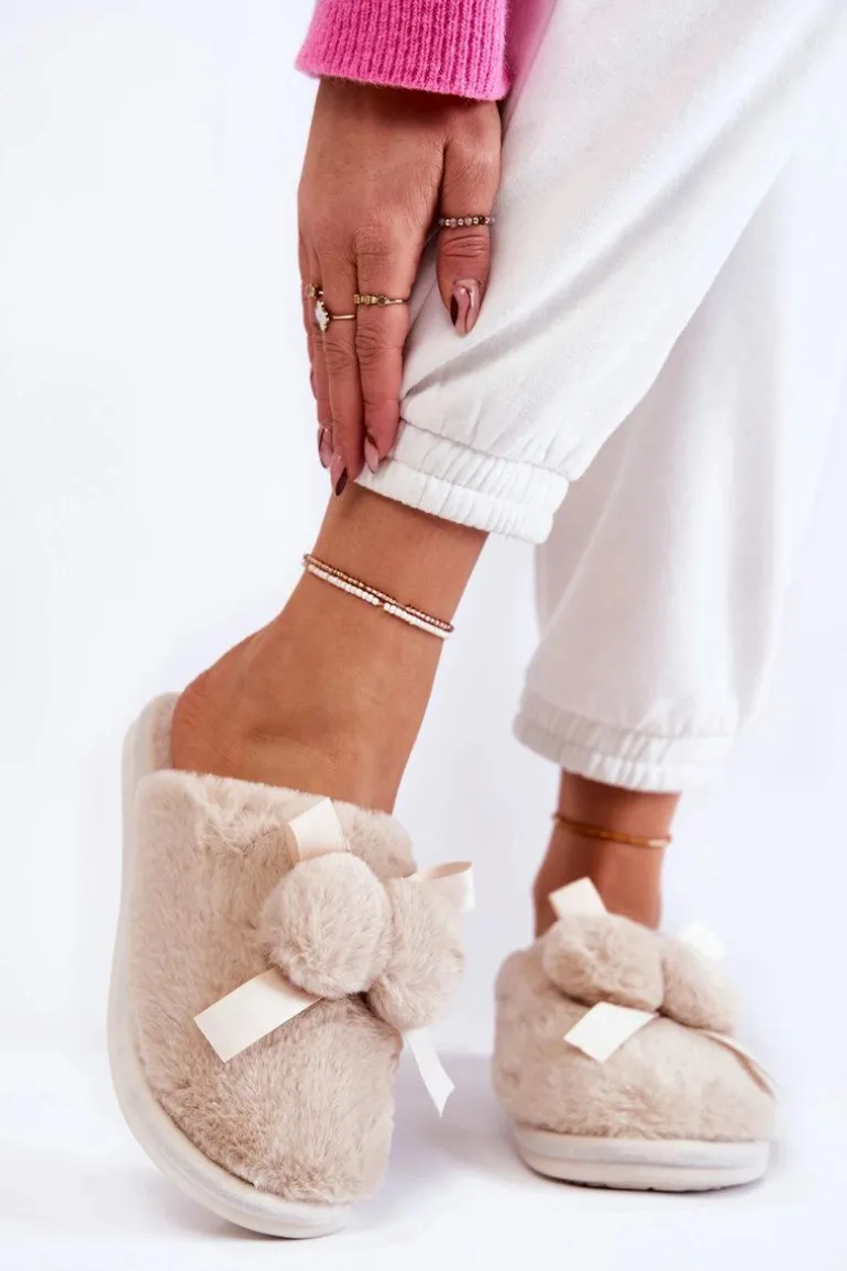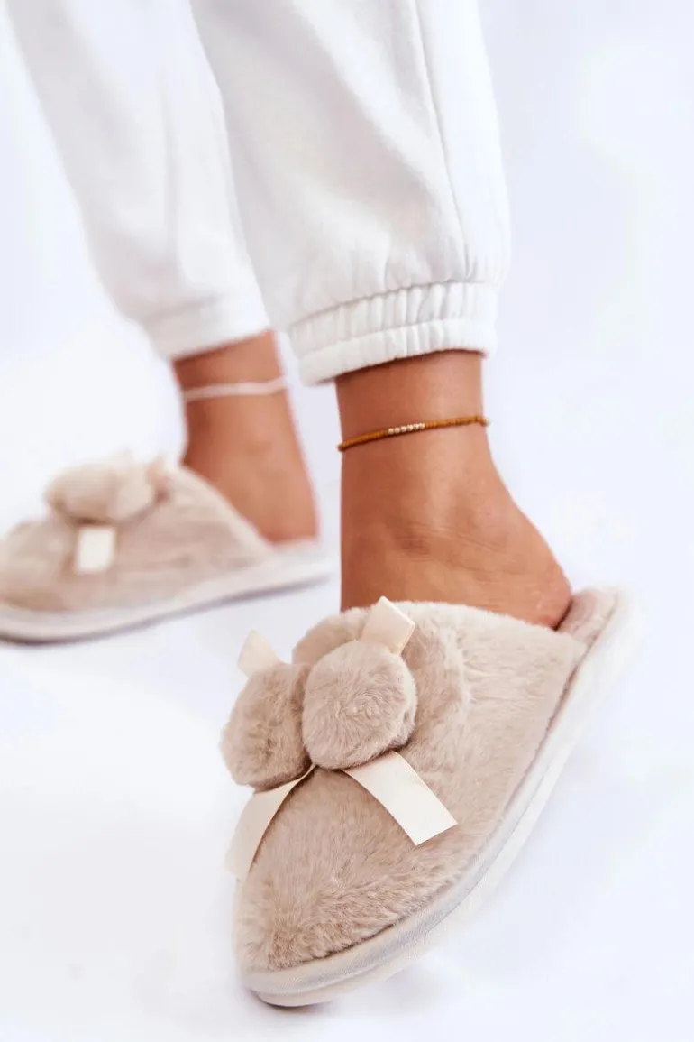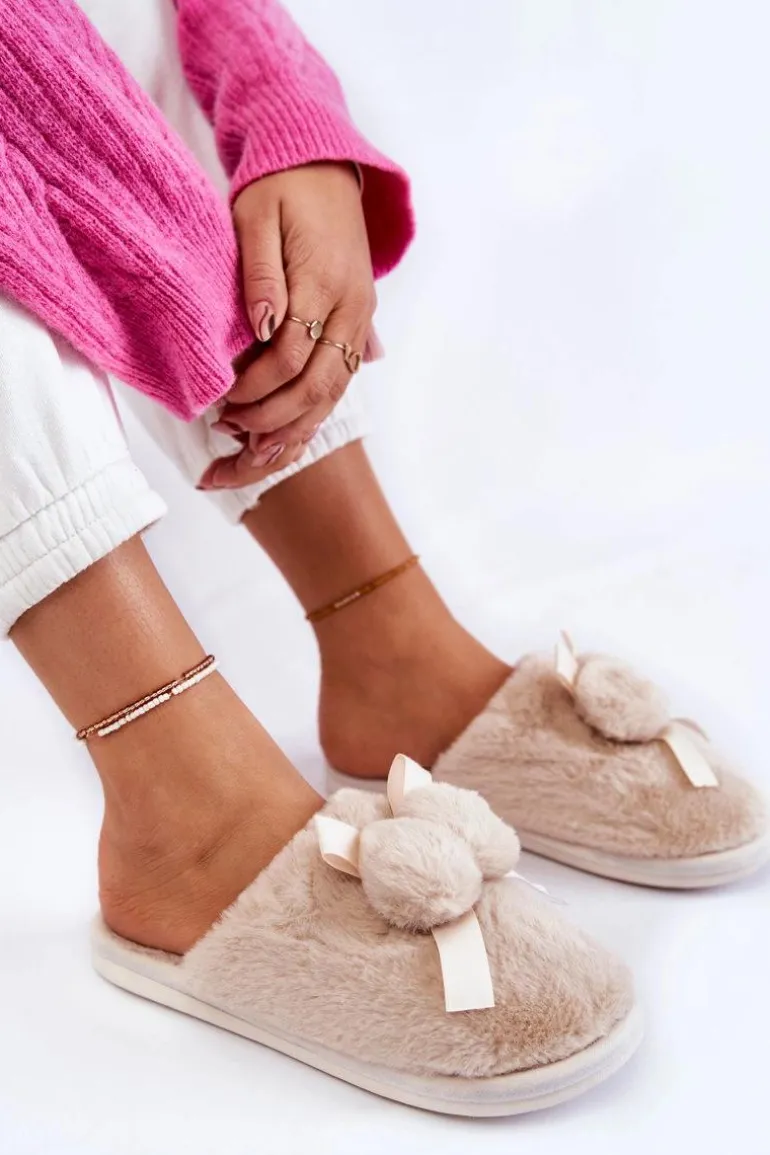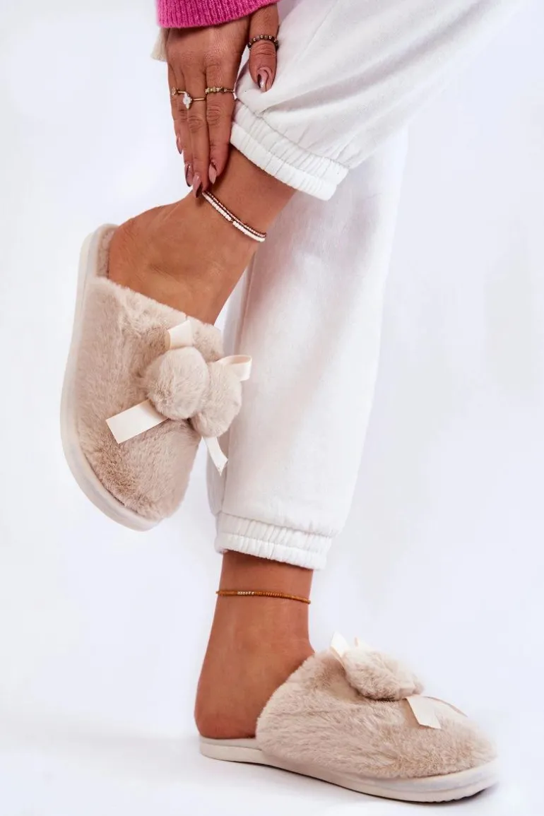 Damskie Futrzane Papcie Z Pomponami Beżowe Castello