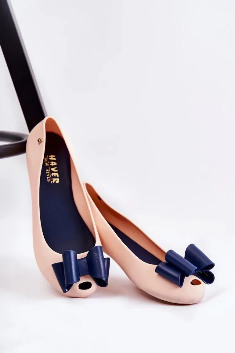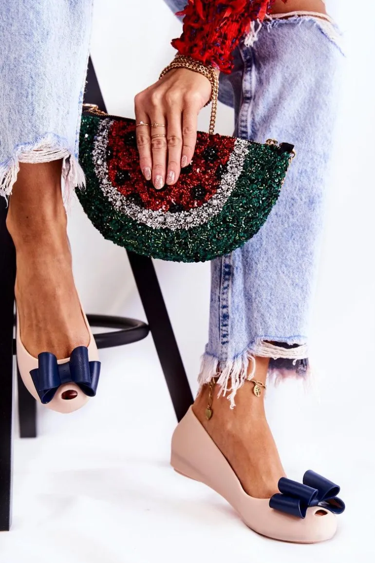 Wyjątkowe baleriny z ozdobną kokardą na przodzie. Dodatkowo na zaokrąglonym nosku znajduje się delikatne wycięcie. Buty zostały wykonane z gumowego tworzywa. Baleriny osadzone są na płaskim obcasie z antypoślizgową podeszwą. Miękka wkładka zapewni komfort podczas użytkowania. Z boku cholewki znajduje się ozdobny element. Te baleriny świetnie sprawdzą się na różnego rodzaju uroczystościach. Przy wyborze rozmiaru prosimy sugerować się tabelą rozmiarów.
