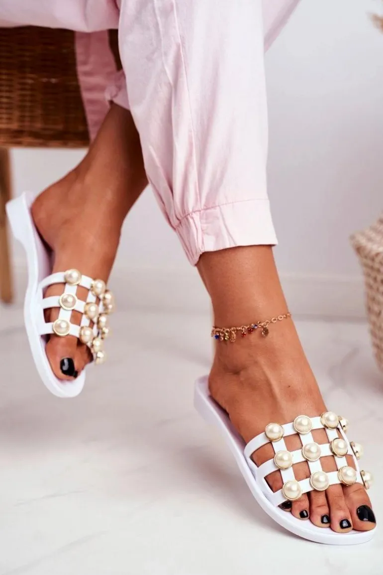 Damskie Gumowe Klapki Białe Perełki Estelle
