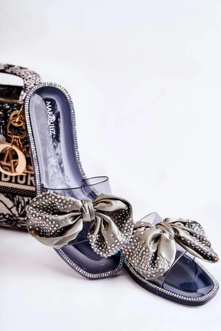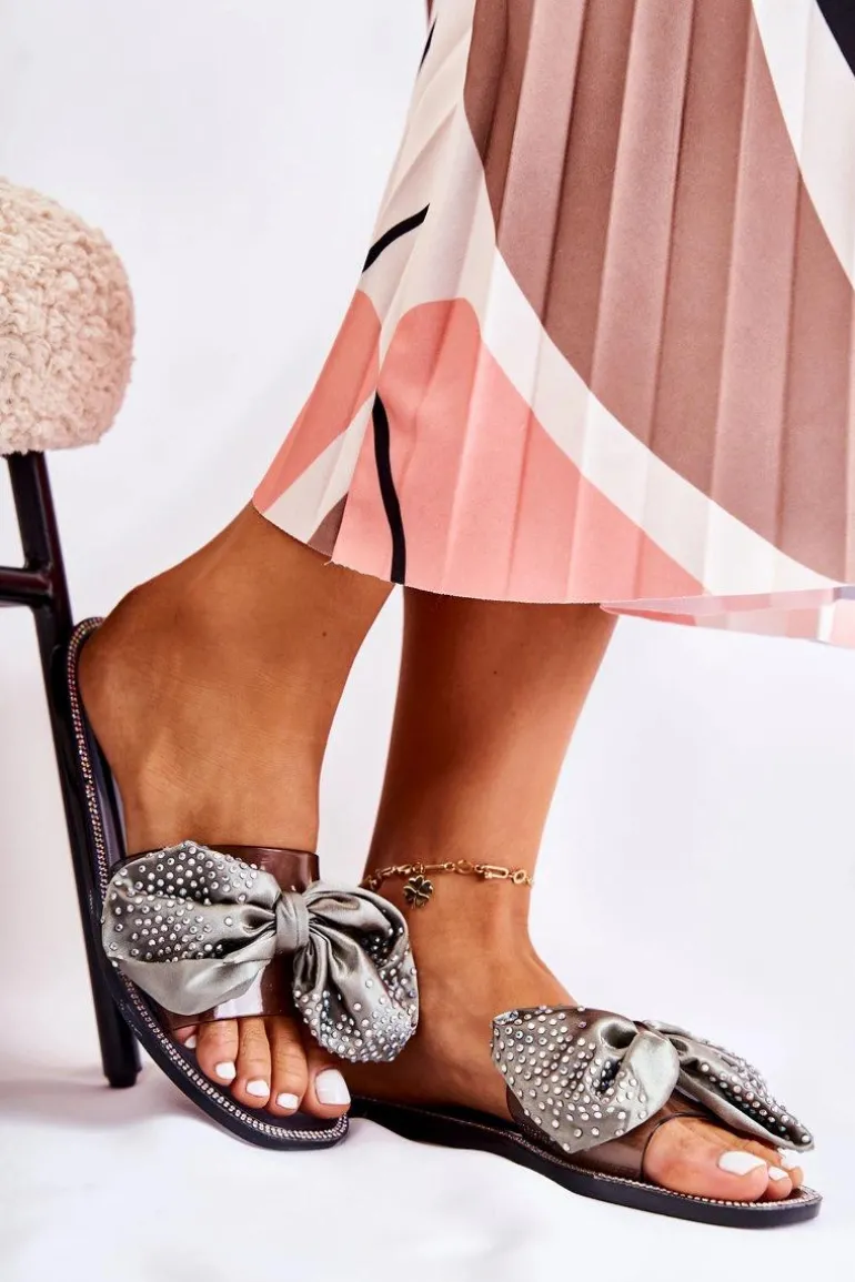 Wyjątkowe damskie klapki z ozdobnymi elementami. Kokarda na przodzie została wykonana z materiału tekstylnego z dodatkami w postaci cyrkonii. Klapki wykonane z gumowego tworzywa. Nosek odkryty, delikatnie kwadratowy. Osadzone na płaskiej podeszwie. Wkładka przyozdobiona mieniącymi się cyrkoniami. Solidny model, idealny na letnie dni! Przy wyborze rozmiaru prosimy sugerować się tabelą rozmiarów.