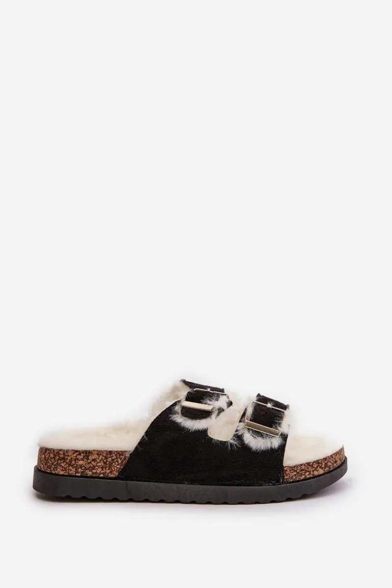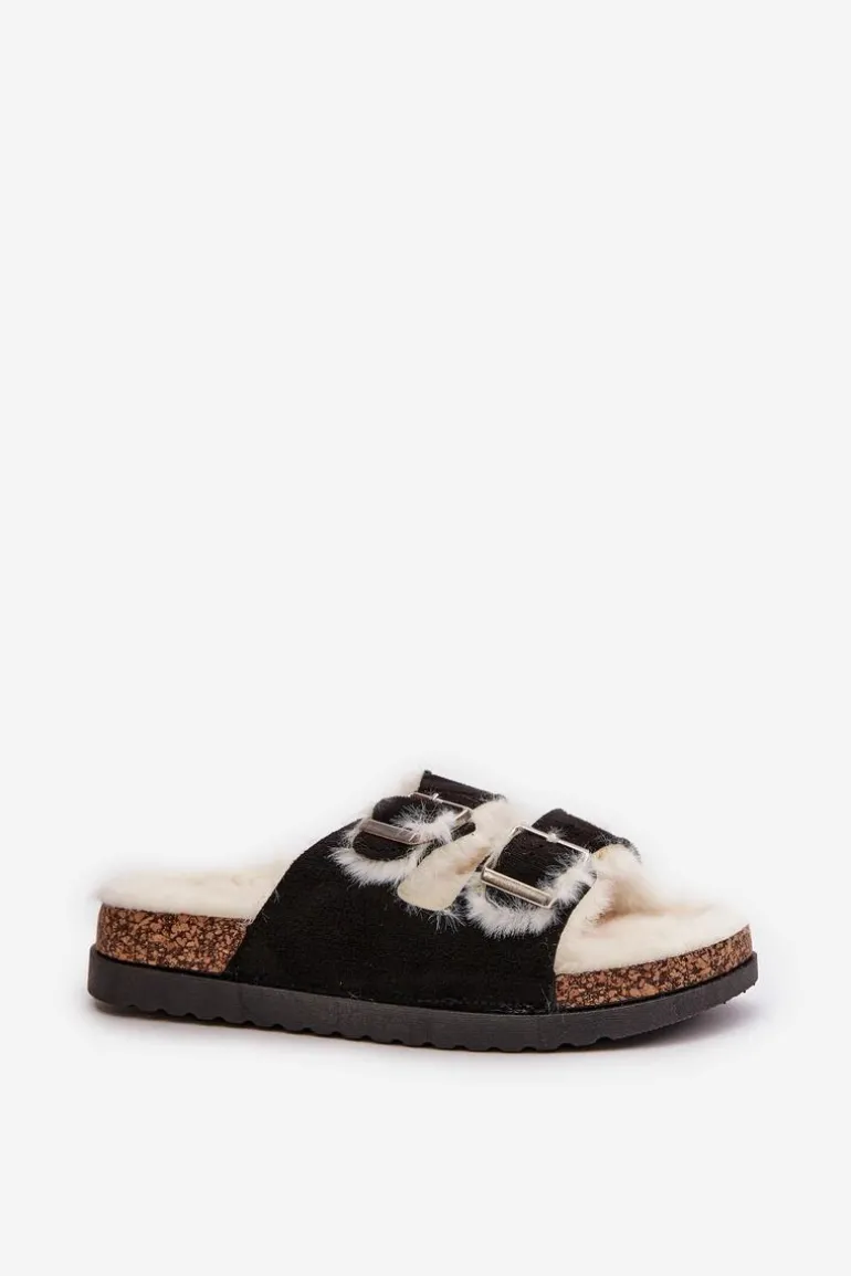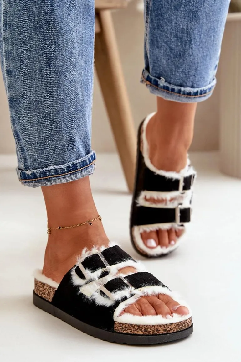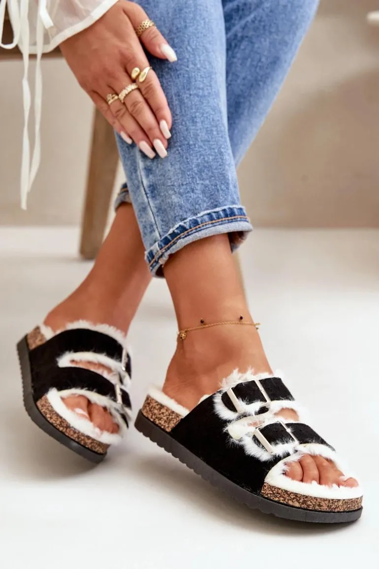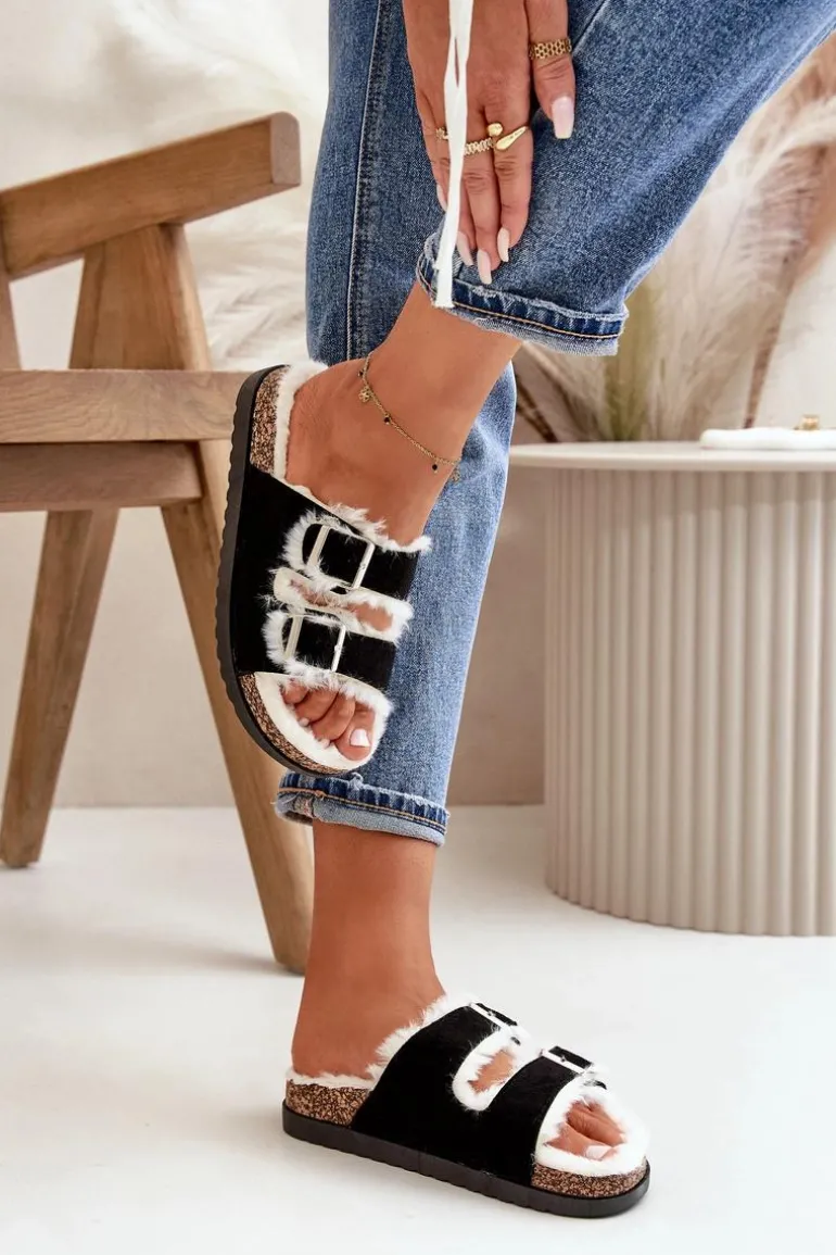 Damskie Kapcie Klapki Z Klamrami I Futerkiem Czarne Ezilena