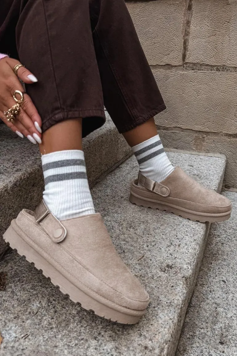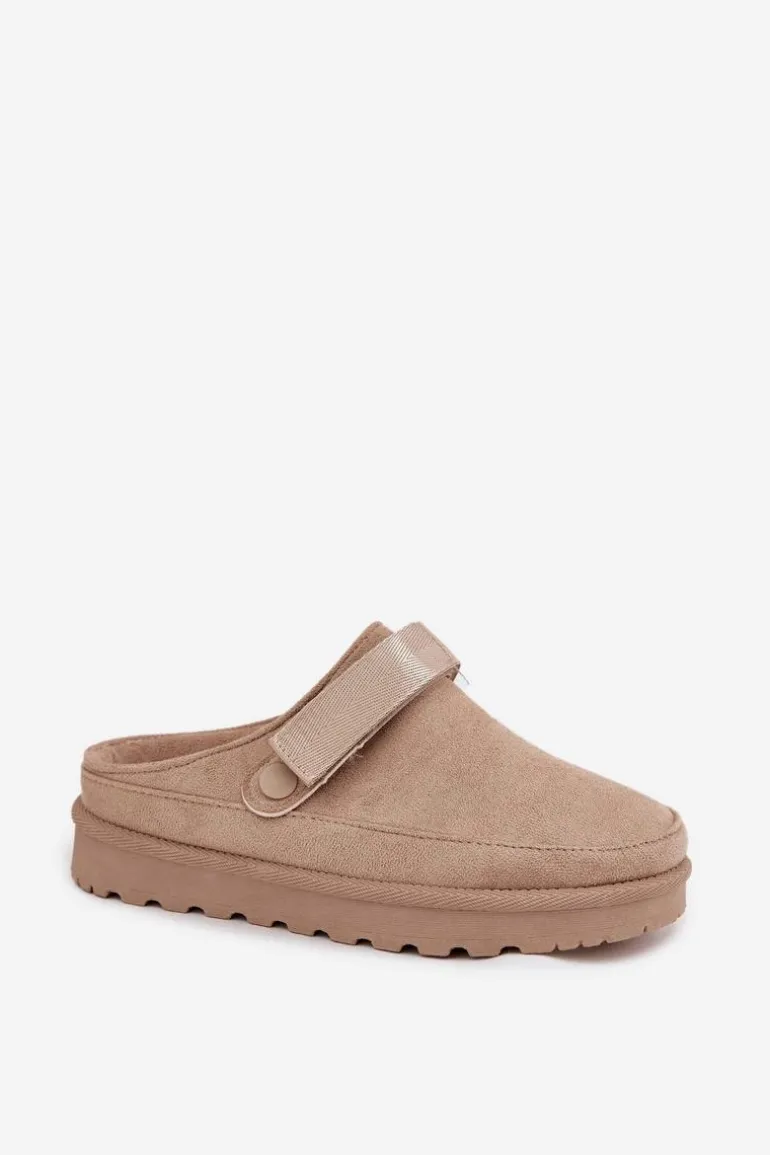 Damskie klapki wykonane z eko zamszu. Osadzone na platformie. Wnętrze ocieplone przyjemnym futerkiem, co zapewnia komfort w chłodniejsze dni. Dodatkowo posiadają ruchomy pasek zapinany na rzep, który stabilizuje piętę i umożliwia idealne dopasowanie. Idealne na co dzień, łączą styl z funkcjonalnością. Przy wyborze rozmiaru prosimy sugerować się tabelą rozmiarów.