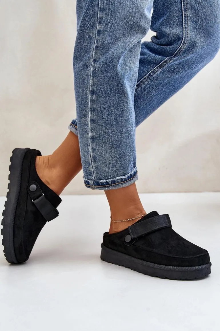 Damskie klapki wykonane z eko zamszu. Osadzone na platformie. Wnętrze ocieplone przyjemnym futerkiem, co zapewnia komfort w chłodniejsze dni. Dodatkowo posiadają ruchomy pasek zapinany na rzep, który stabilizuje piętę i umożliwia idealne dopasowanie. Idealne na co dzień, łączą styl z funkcjonalnością. Przy wyborze rozmiaru prosimy sugerować się tabelą rozmiarów.