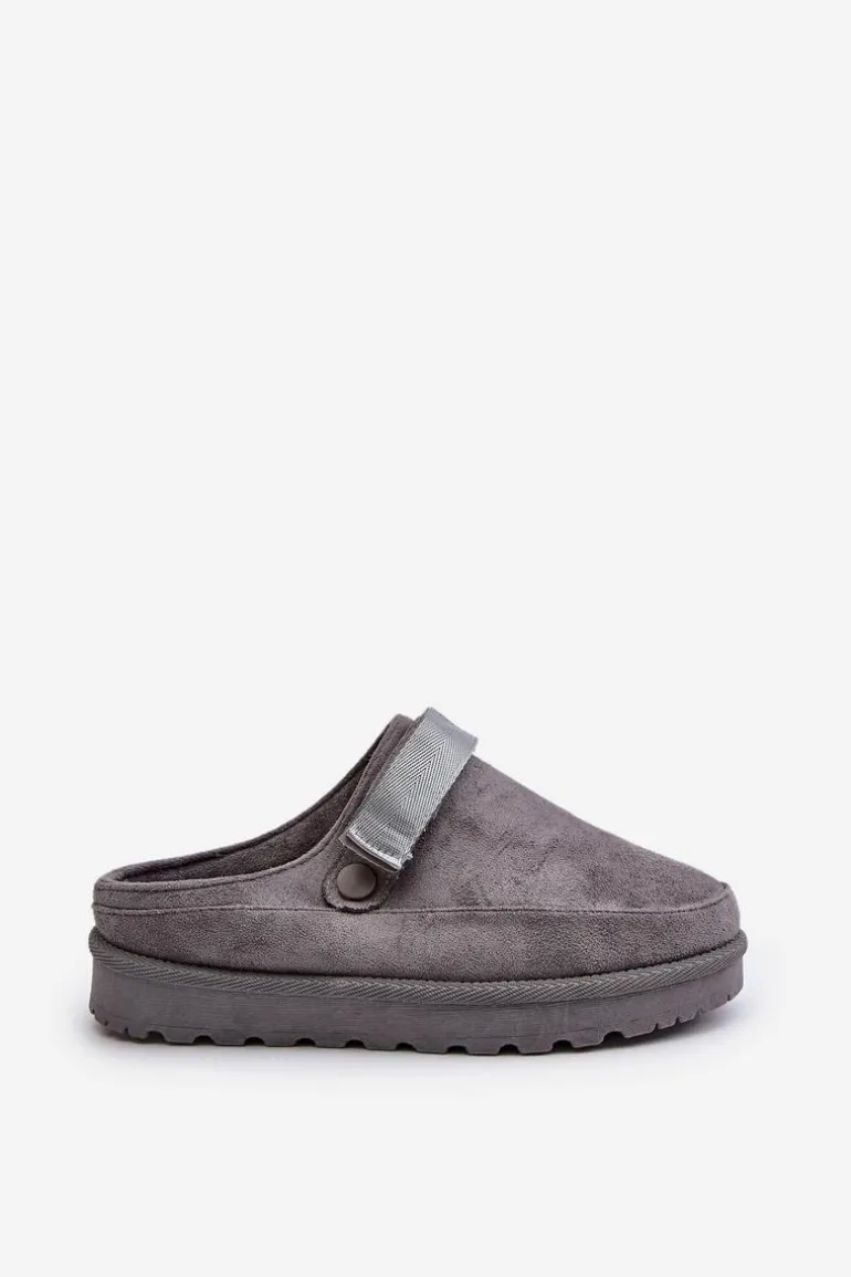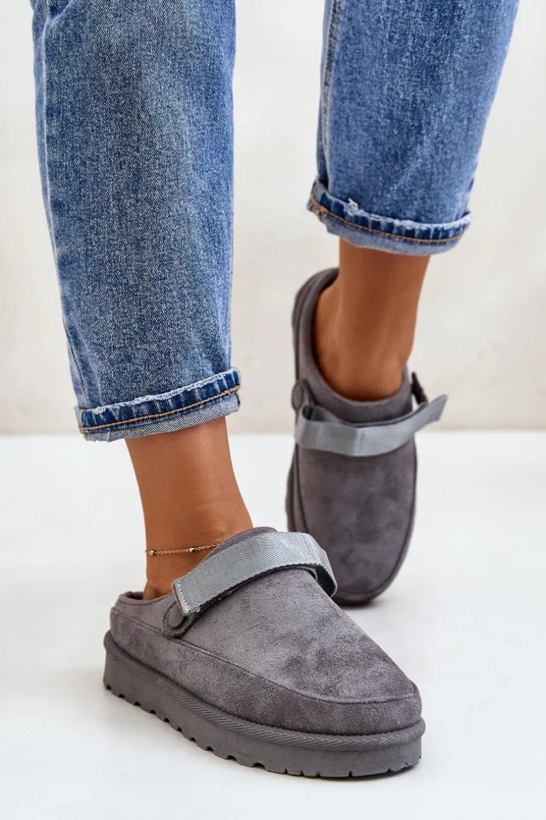 Damskie klapki wykonane z eko zamszu. Osadzone na platformie. Wnętrze ocieplone przyjemnym futerkiem, co zapewnia komfort w chłodniejsze dni. Dodatkowo posiadają ruchomy pasek zapinany na rzep, który stabilizuje piętę i umożliwia idealne dopasowanie. Idealne na co dzień, łączą styl z funkcjonalnością. Przy wyborze rozmiaru prosimy sugerować się tabelą rozmiarów.
