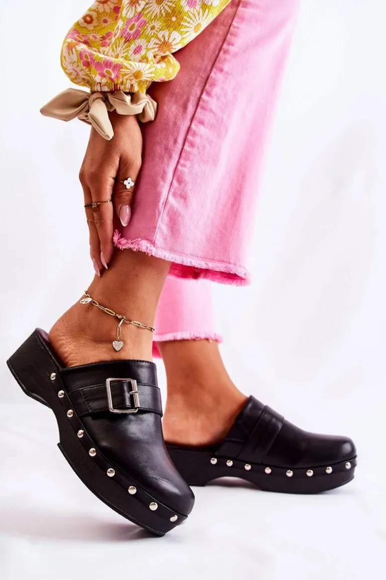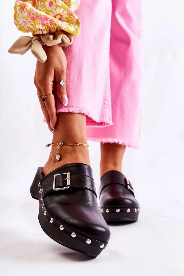 Klasyczny model damskich chodaków osadzony na obcasie i platformie. Model wsuwany. Przyozdobione na przodzie paskiem ze sprzączką. Dodatkowo wokół podeszwy znajdują się ozdobne ćwieki. Podeszwa wykonana z gumowego tworzywa, antypoślizgowa. Model ten dodatkowo posiada gumkę, dzięki której but będzie odpowiednio dopasowany do tęgości nogi. Wkładka wykonana z eko skóry. Model ten świetnie sprawdzi się na co dzień. Nosek zakryty, zaokrąglony. Przy wyborze rozmiaru prosimy sugerować się tabelą rozmiarów.