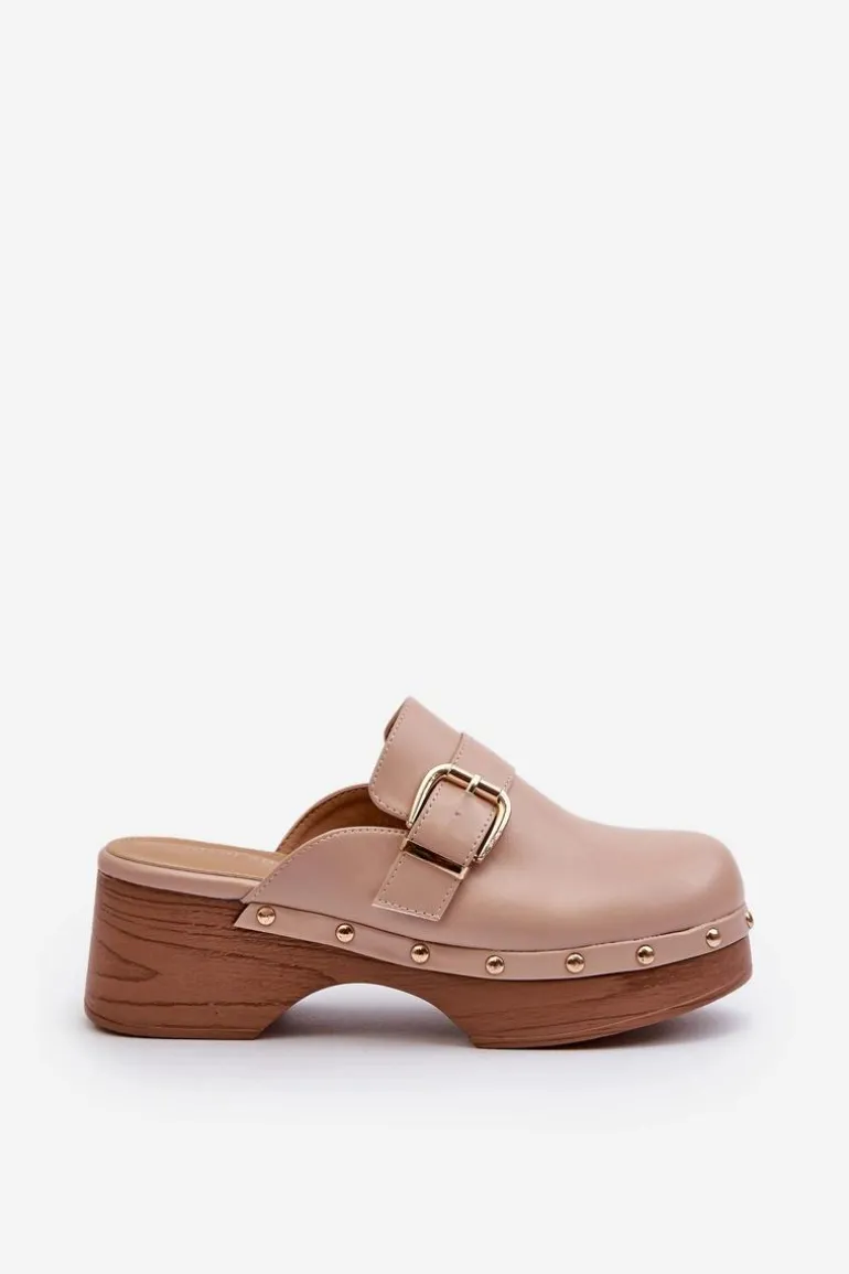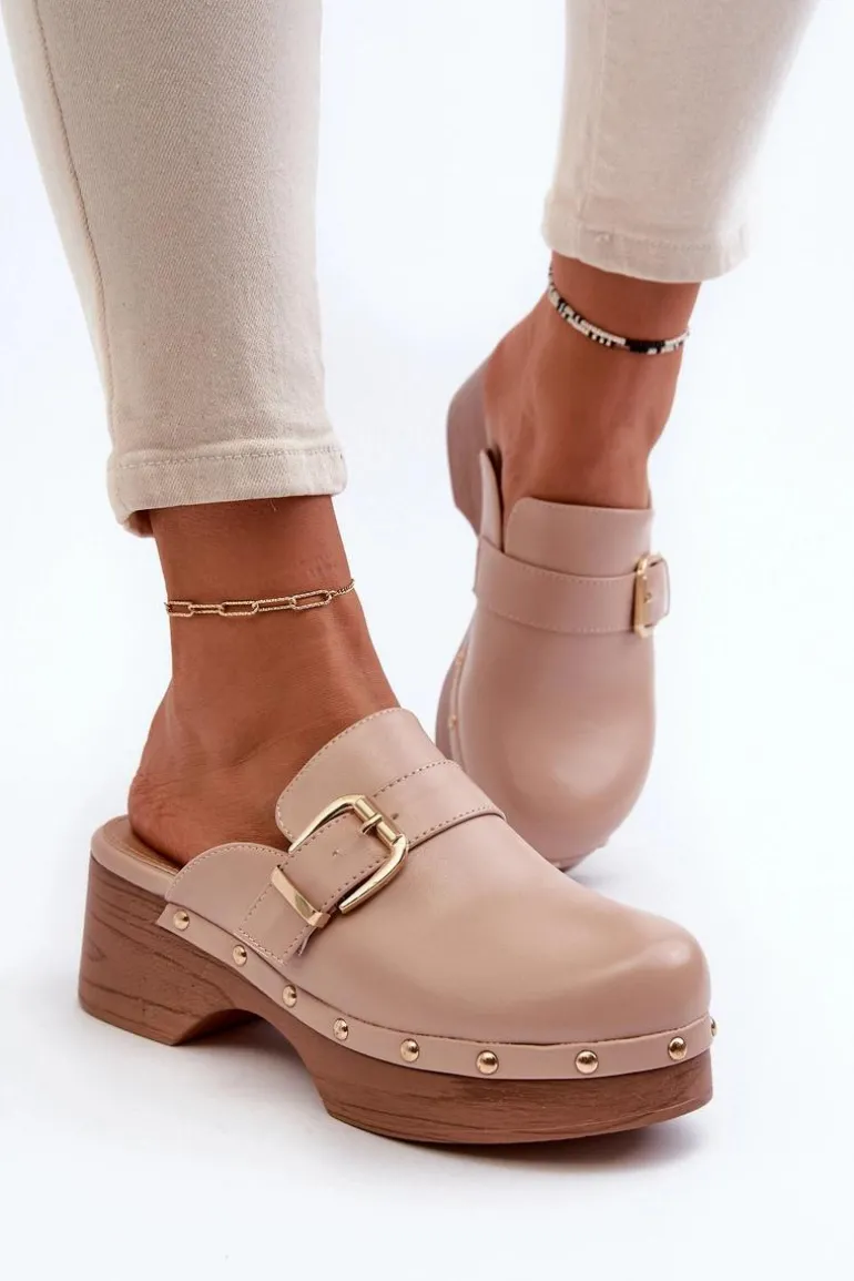 Lekkie klapki osadzone na obcasie i platformie, co nadaje im subtelny wyraz. Na cholewce pasek z klamrą oraz ozdobne ćwieki wokół podeszwy. Wykonane z eko skóry, zarówno cholewka, jak i wkładka gwarantują trwałość i komfort noszenia. Ten model świetnie komponuje się z codziennymi stylizacjami, dodając im nuty szyku i wyrafinowania. Przy wyborze rozmiaru prosimy sugerować się tabelą rozmiarów.