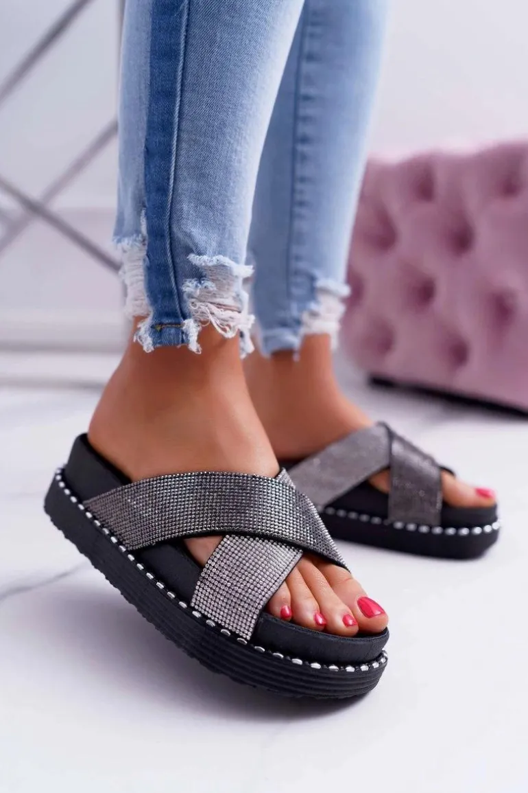 Czarne klapki osadzone na wysokiej platformie. Świetnie sprawdzą się w słoneczne, letnie dni. Zdobione drobnymi kryształkami na wierzchu. Przy wyborze rozmiaru, prosimy kierować się tabelą rozmiarów.