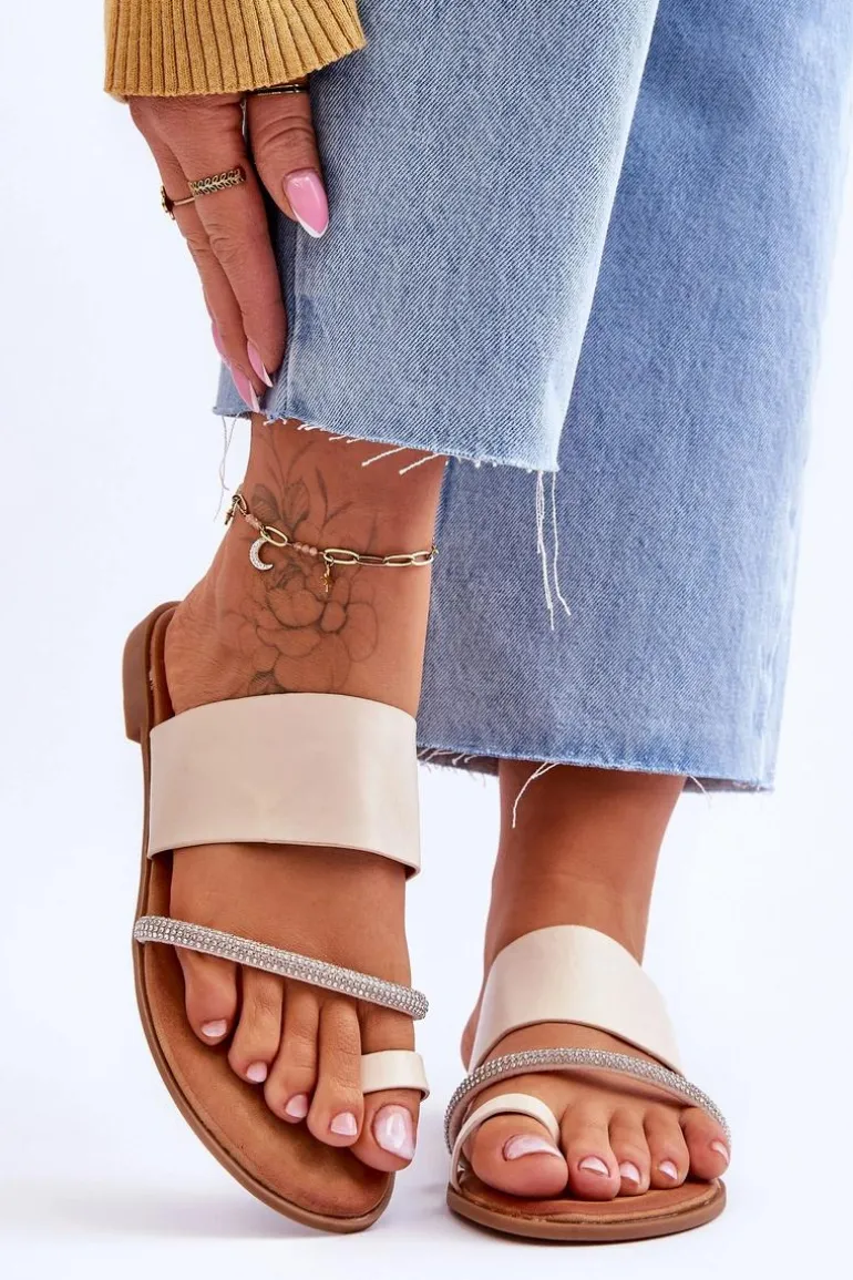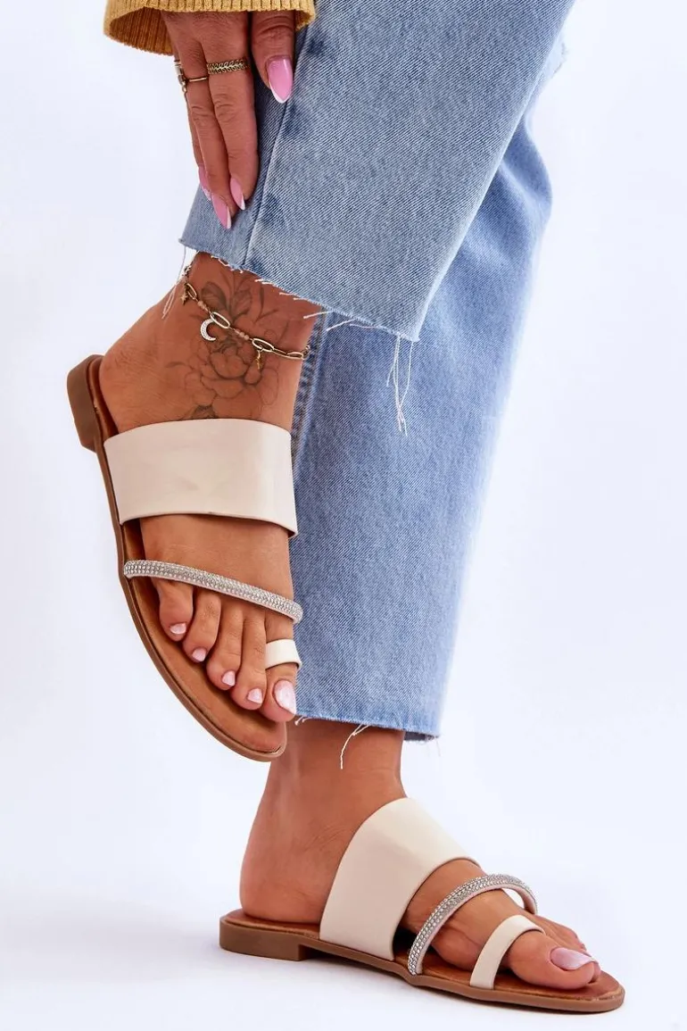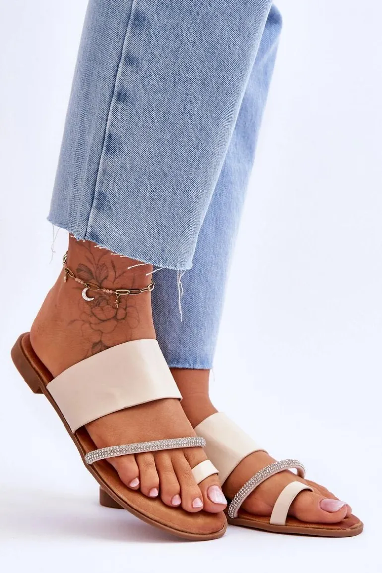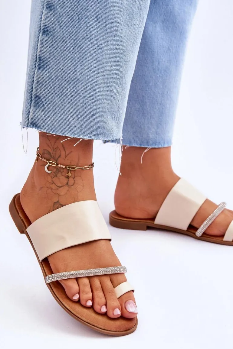 Klasyczne klapki o fasonie japonek zostały wykonane z eko skóry. Posiadają ozdobny paseczek z mieniącymi się dżetami imitującymi cyrkonie. Osadzone na płaskim obcasie z podeszwą z tworzywa sztucznego. Model ten świetnie sprawdzi się do wielu letnich stylizacji. Japonki posiadają miękką, eko skórzaną wkładkę.