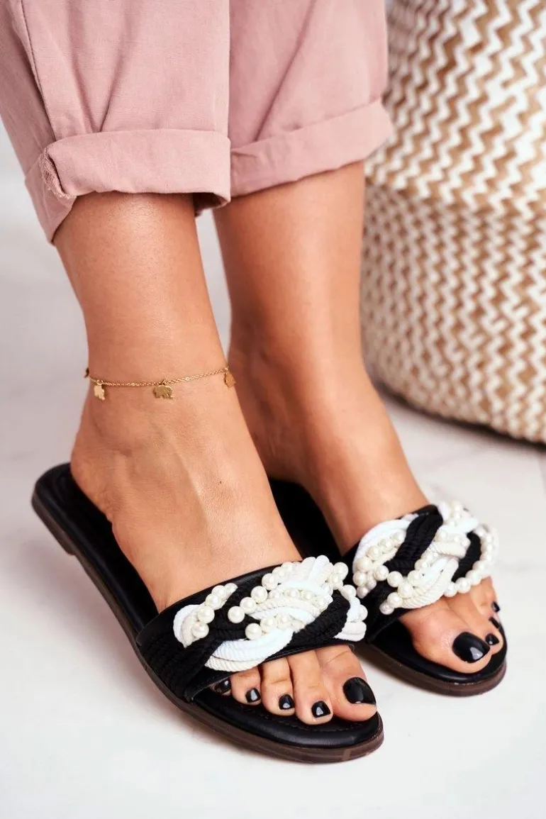 Damskie Klapki Lu Boo Czarne Perełki Plecionki Flora